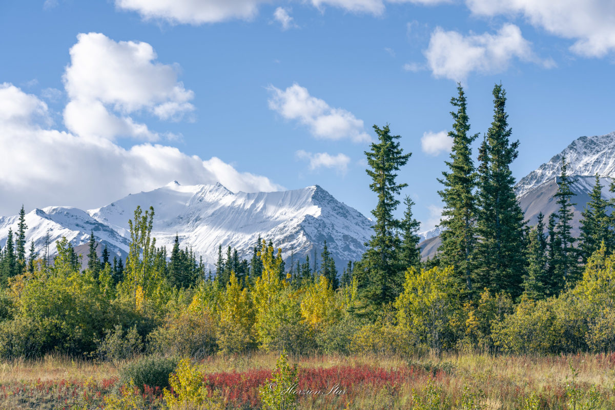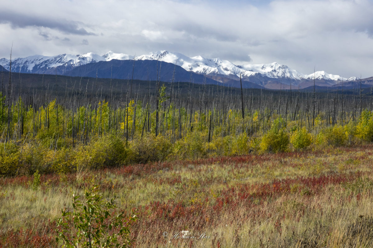 路边的过火的枯林,重生的灌木,鲜红的草叶以及远处的雪山