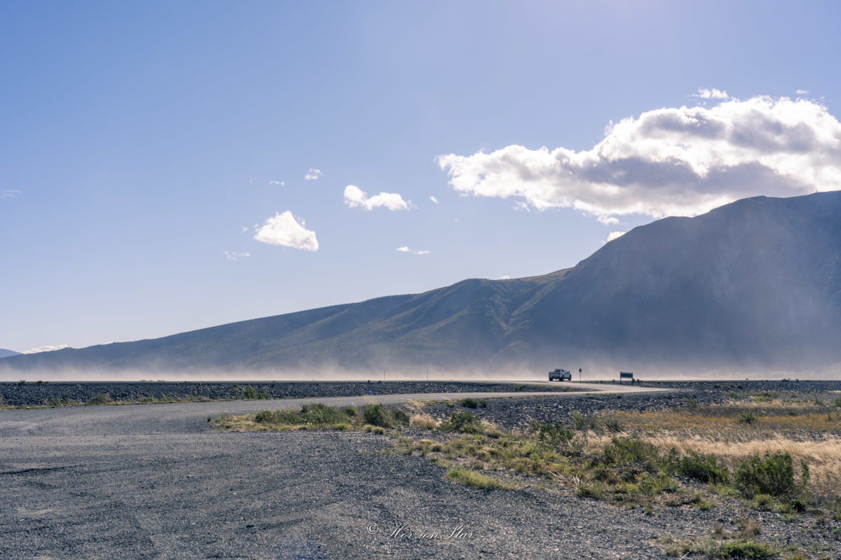 过桥往Visitor Center开,黄沙漫天,烟雾弥漫,为什么冰川湖泊开出了大漠孤烟的情怀?