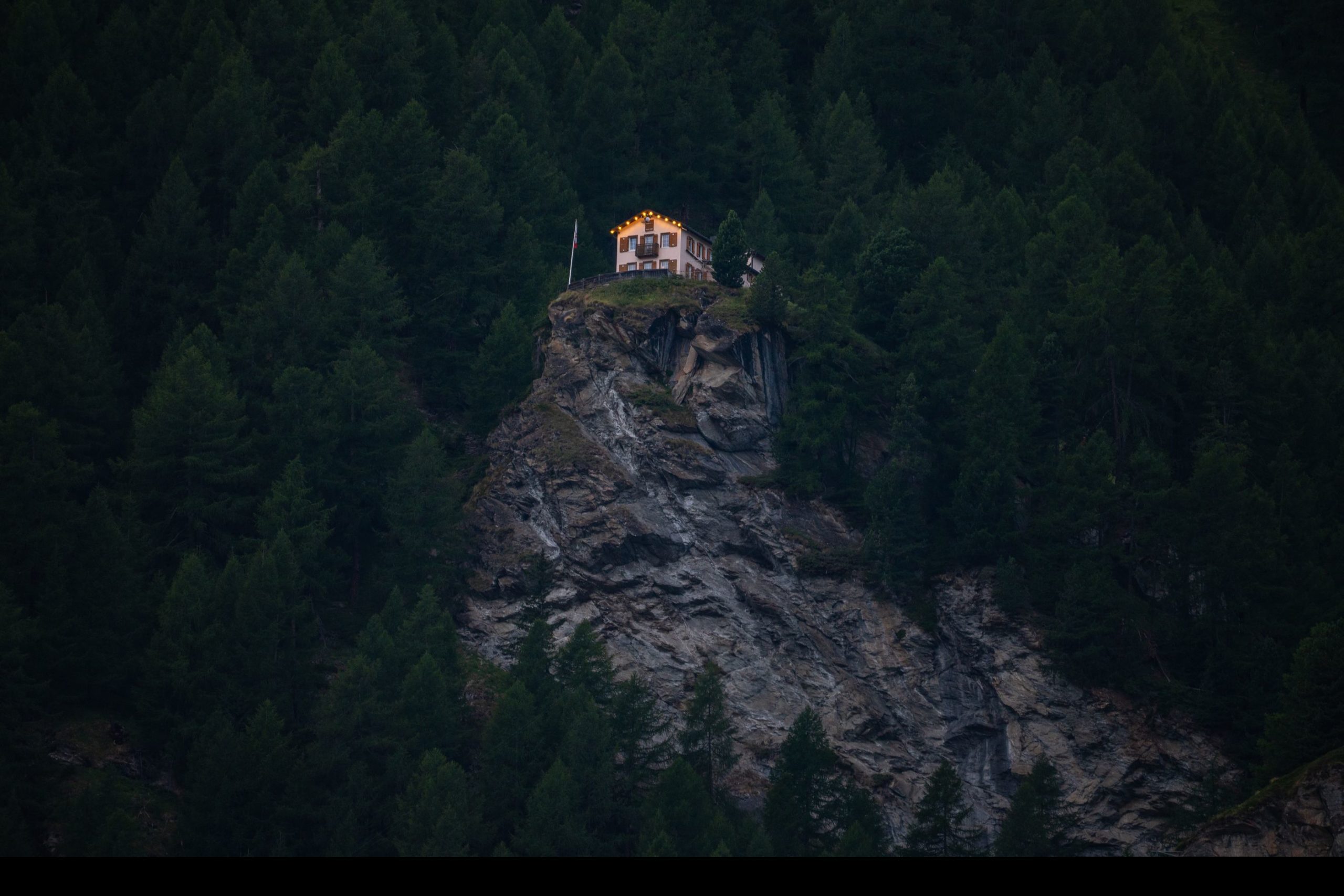 夜幕降临,半山腰的登山小屋亮起了灯。