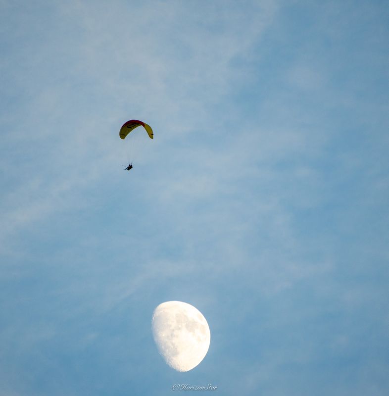 黄昏终于逐渐到来,两人坐在阳台上,吃着水果,看着降落伞飘浮在月亮之上