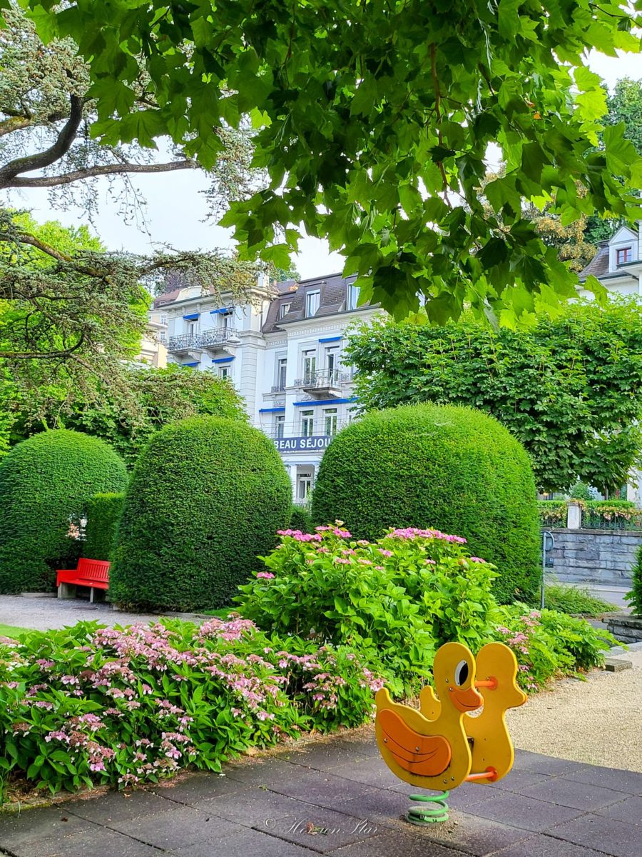 酒店马路对面就是个小公园,摆着几个儿童游乐的设施。地面是厚厚的塑胶,防止小朋友跌倒受伤。瑞士小朋友真幸福,可以随便摔。