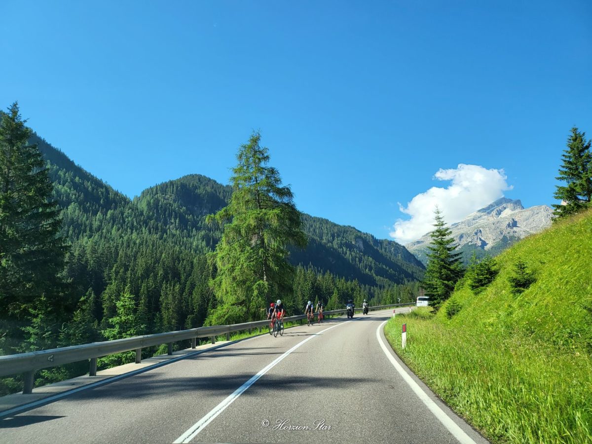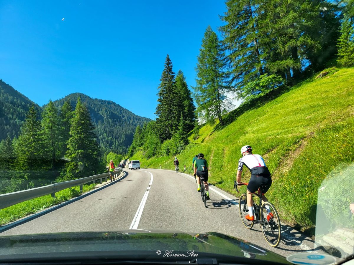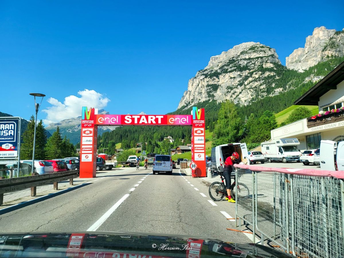 正奇怪哪来的那么多自行车路障呢,就看到了这个门。原来明天国际自行车赛事Maratona del Dolomites将在这里举行。有6900多 路障 骑手参赛。最老的竟然有超过80岁的参赛选手!再加上今日天气晴好,又赶上周六。于是专业的,非专业的都来这里骑车。