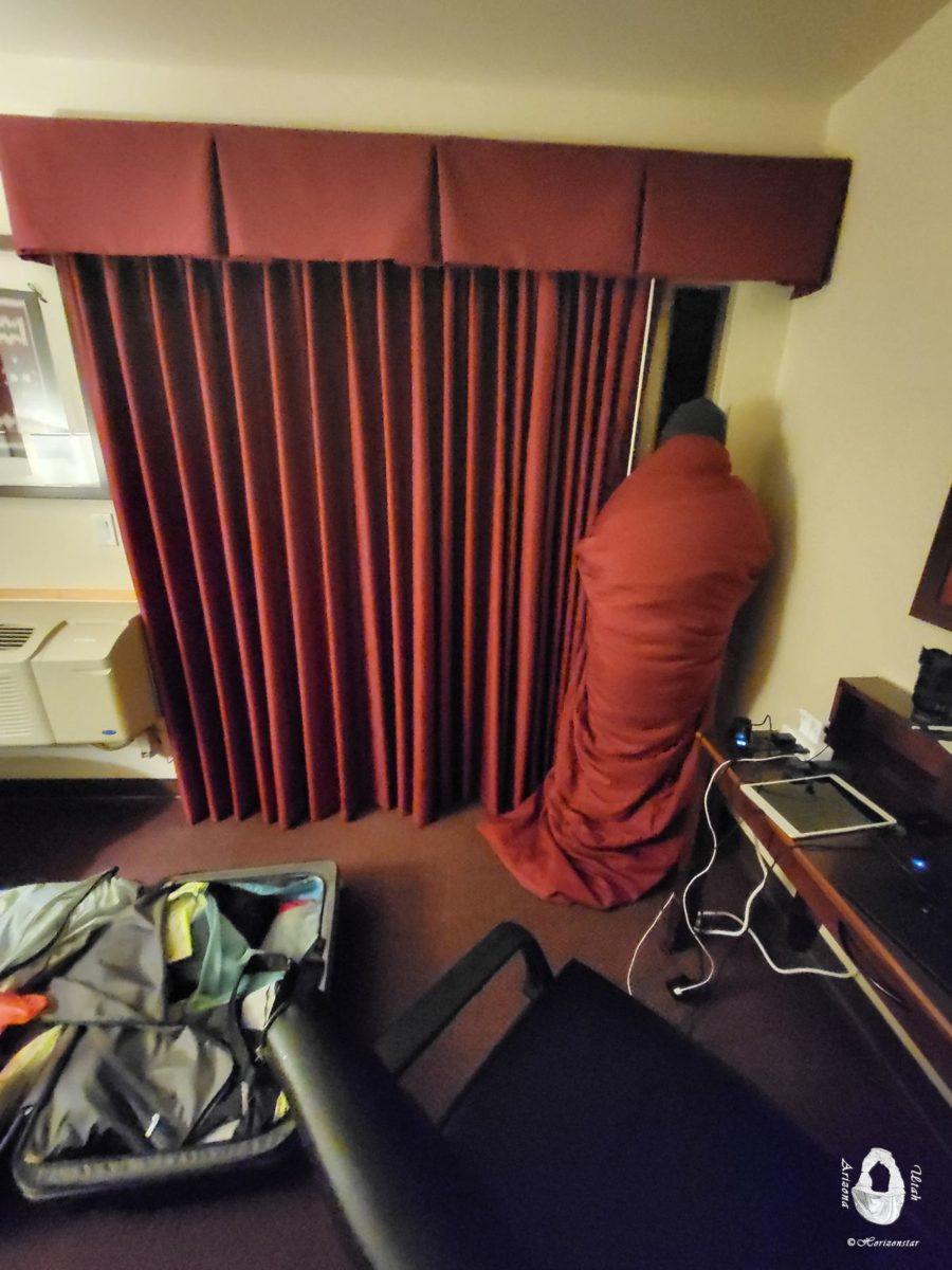 公路在犹他州和亚利桑那州的左右横跳中,到达了公园里唯一的酒店: The View。The View号称每一个房间都是最佳观景台,在阳台上都能看到纪念碑的明信片石柱。一般情况下至少半年前就被预定一空。这次还是托疫情的福,提前一个月就订到了最后几间中的一间,而且是正中的三楼位置,不靠左边的大堂,右边的山峰。这两侧在晚上探照灯的照耀下,拍星空只是个梦。这个也是本次行程除了在Kanab镇的Best Western之外唯一预定的酒店。