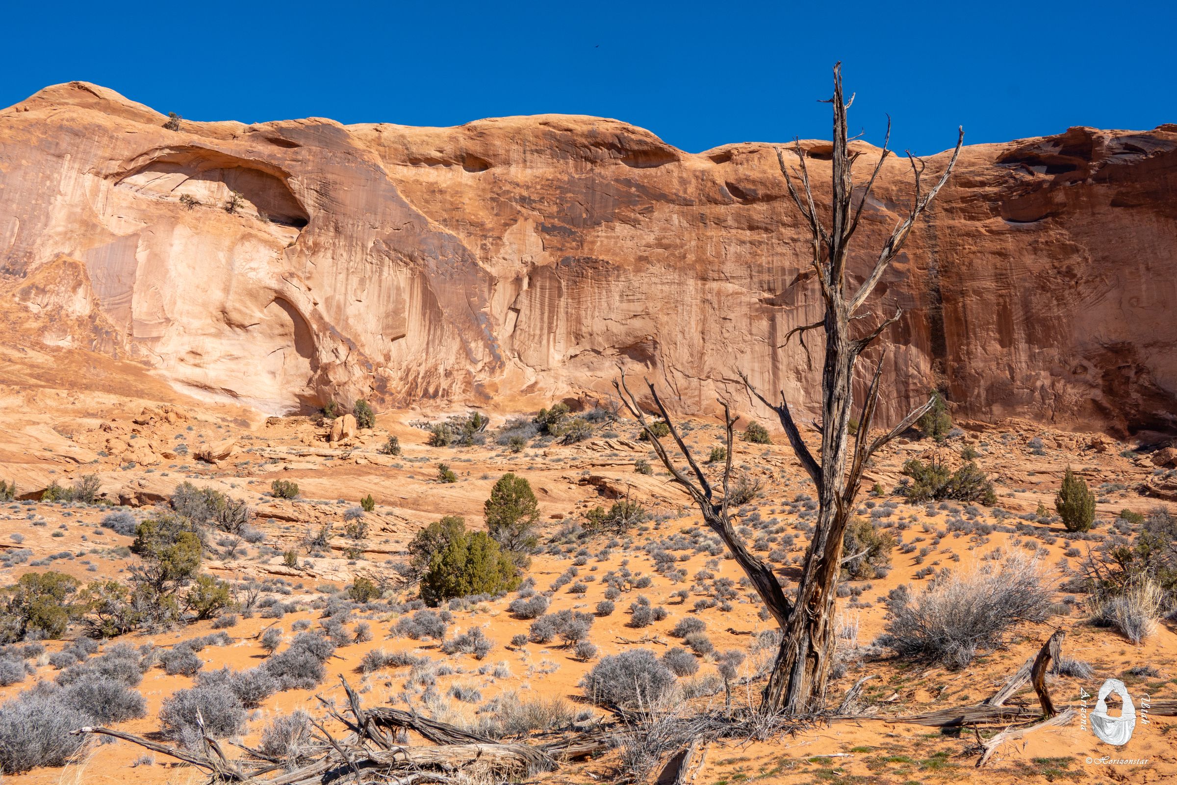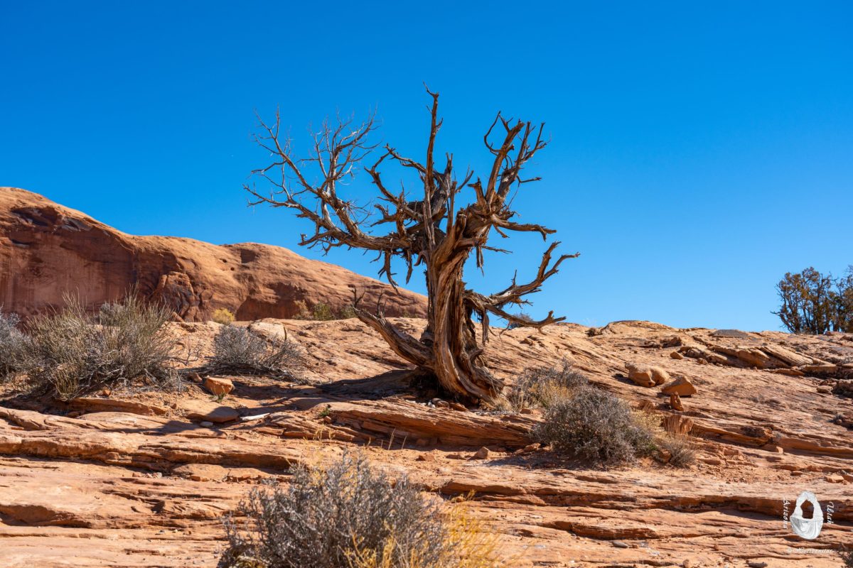 一株株枯死的老树,依旧挺立在石间,见证着拱门的诞生与消亡。让我们想起了纳米比亚的死亡谷里的树木的化石。