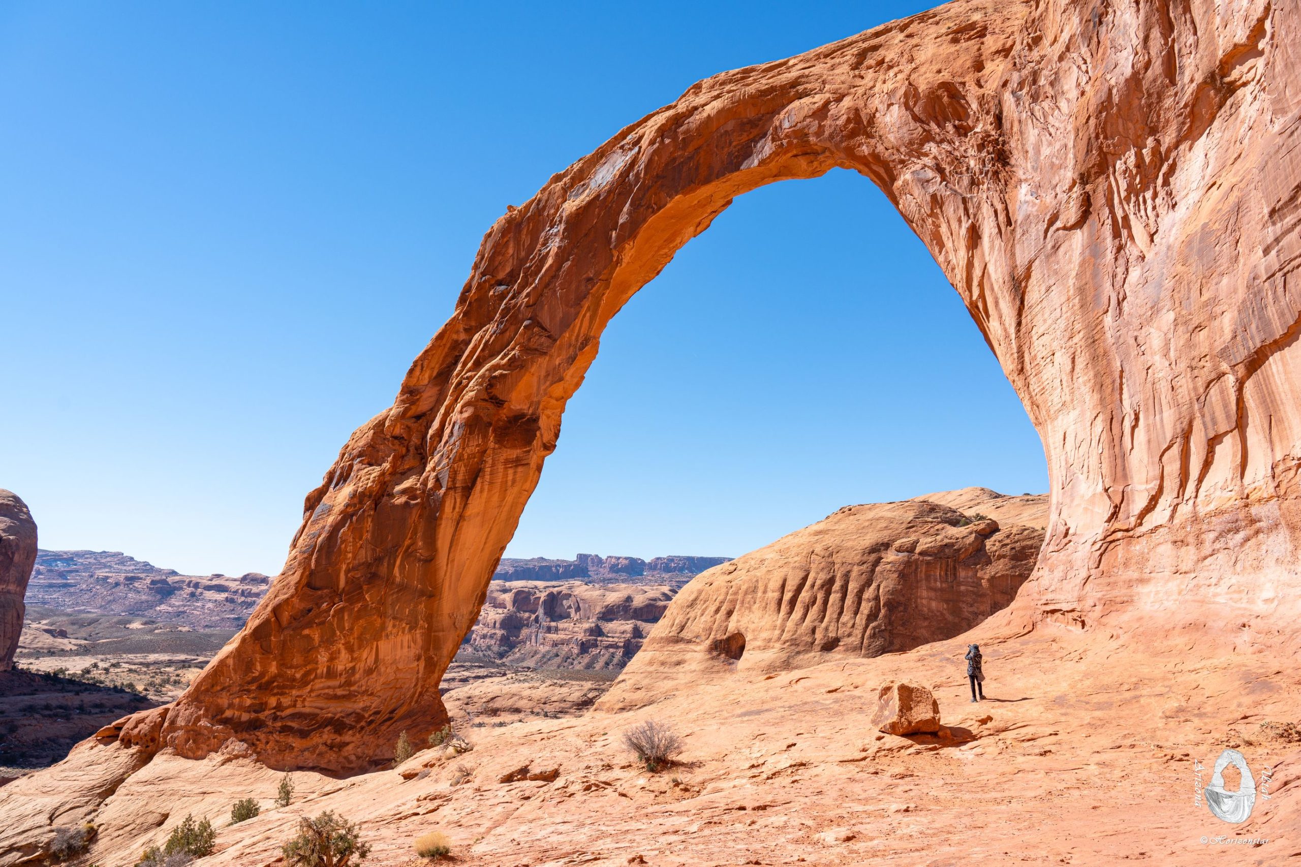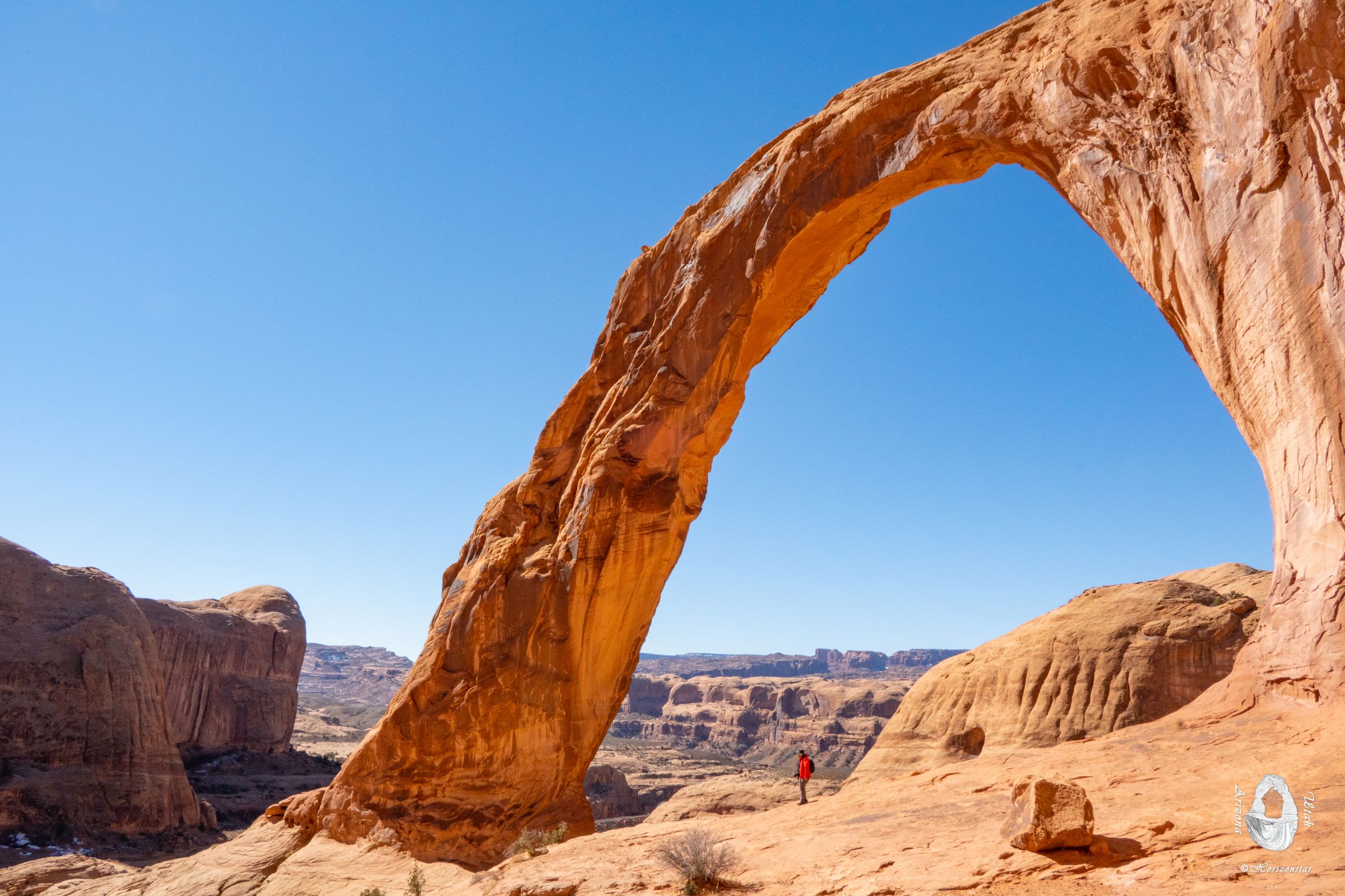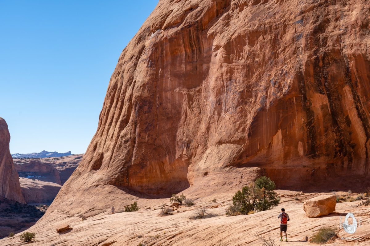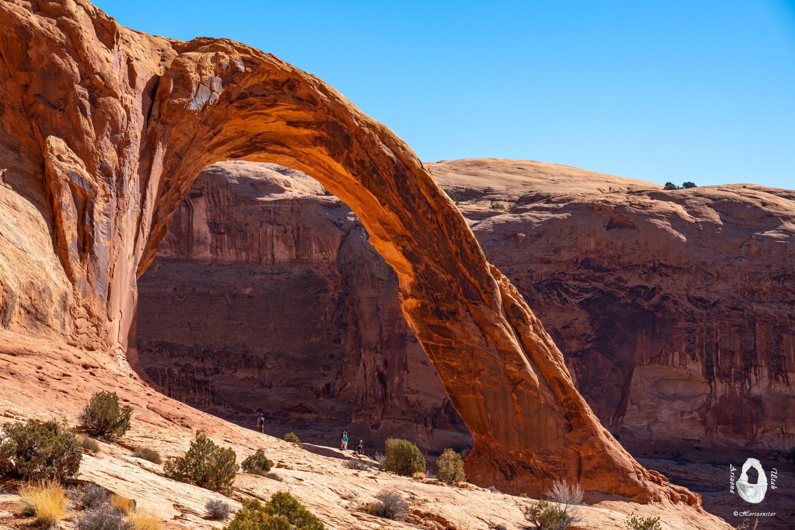 走走停停,看看远方不同角度下的Corona Arch,赞叹自然的鬼斧神工。几个游客在拱门下,仰望巨大的拱门。
