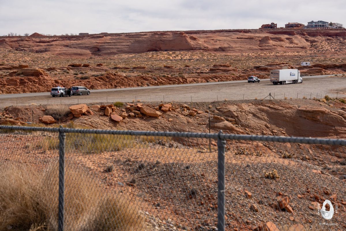 穿过重重山岭,进入Page。到处是警车。到了Glen Canyon Dam上,更是警车一窝蜂。因为速度到这里从44降到35又降到25。每次开车经过这里,总是有一两辆警车在开罚单。Page警方为了自己的福利也是很拼了。