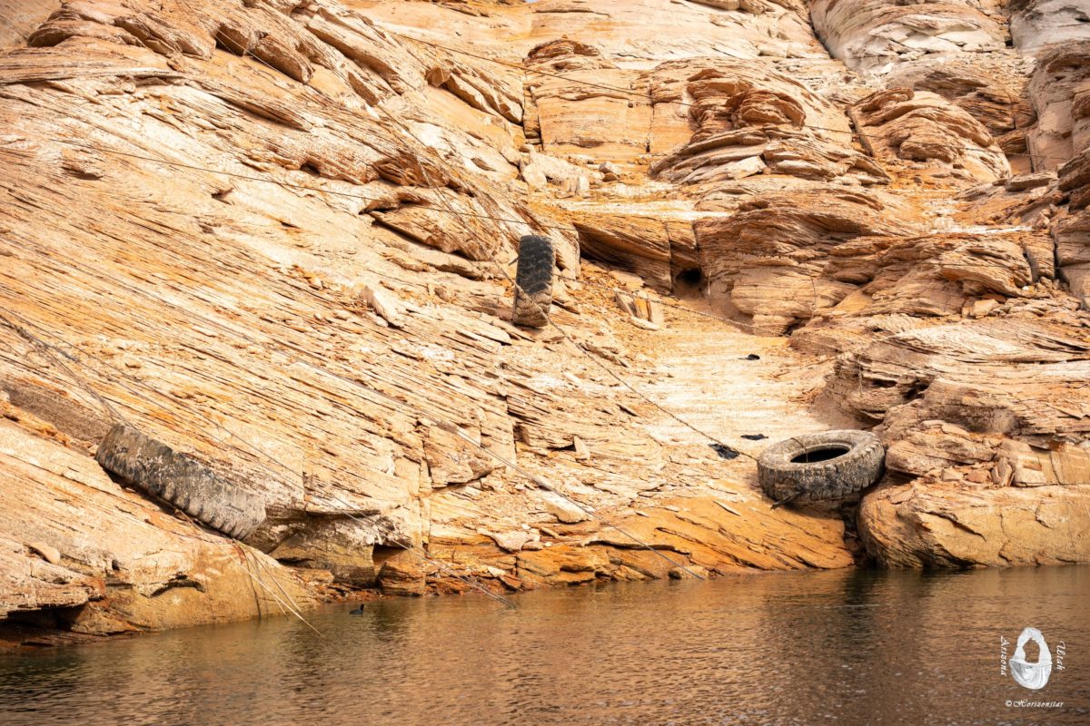 这些废弃的轮胎见证了Powell湖水位的变化。原本是挂在水面的位置,防撞的。一次又一次的降低。