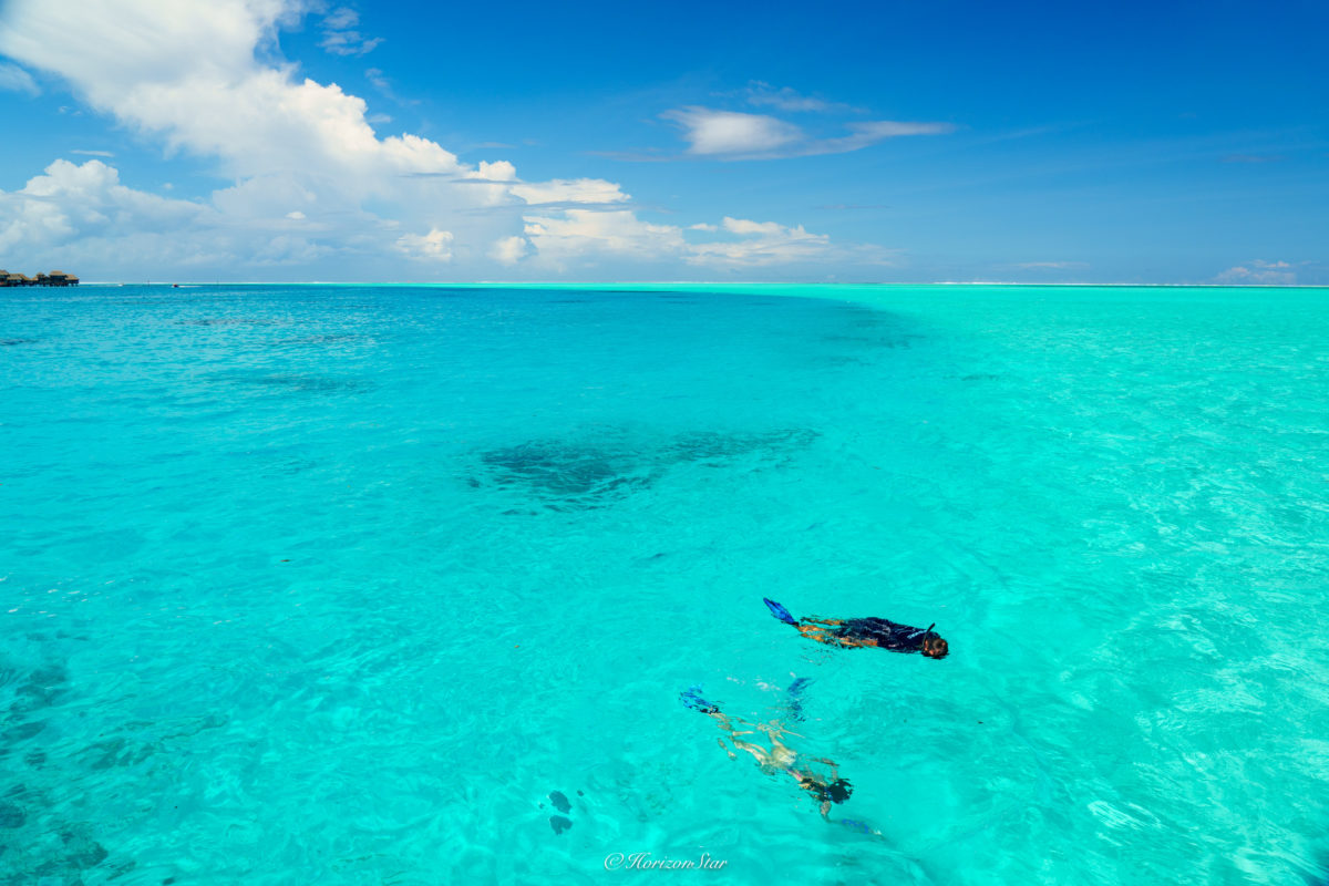 Bora Bora最著名的莫过于它的海水颜色, 据说有50种蓝色。比起马尔代夫的12种蓝(也有说5种),不可同日而语了。各种不同色度的蓝色的形成,是因为珊瑚环礁形成澙湖,深浅变化映照处的天光不同。海底也不是普通的海底,而是珊瑚遗骸被海浪水流常年碾磨成白色粉末,映照在烈日下,呈现出梦幻般浓淡不同蓝绿色。
