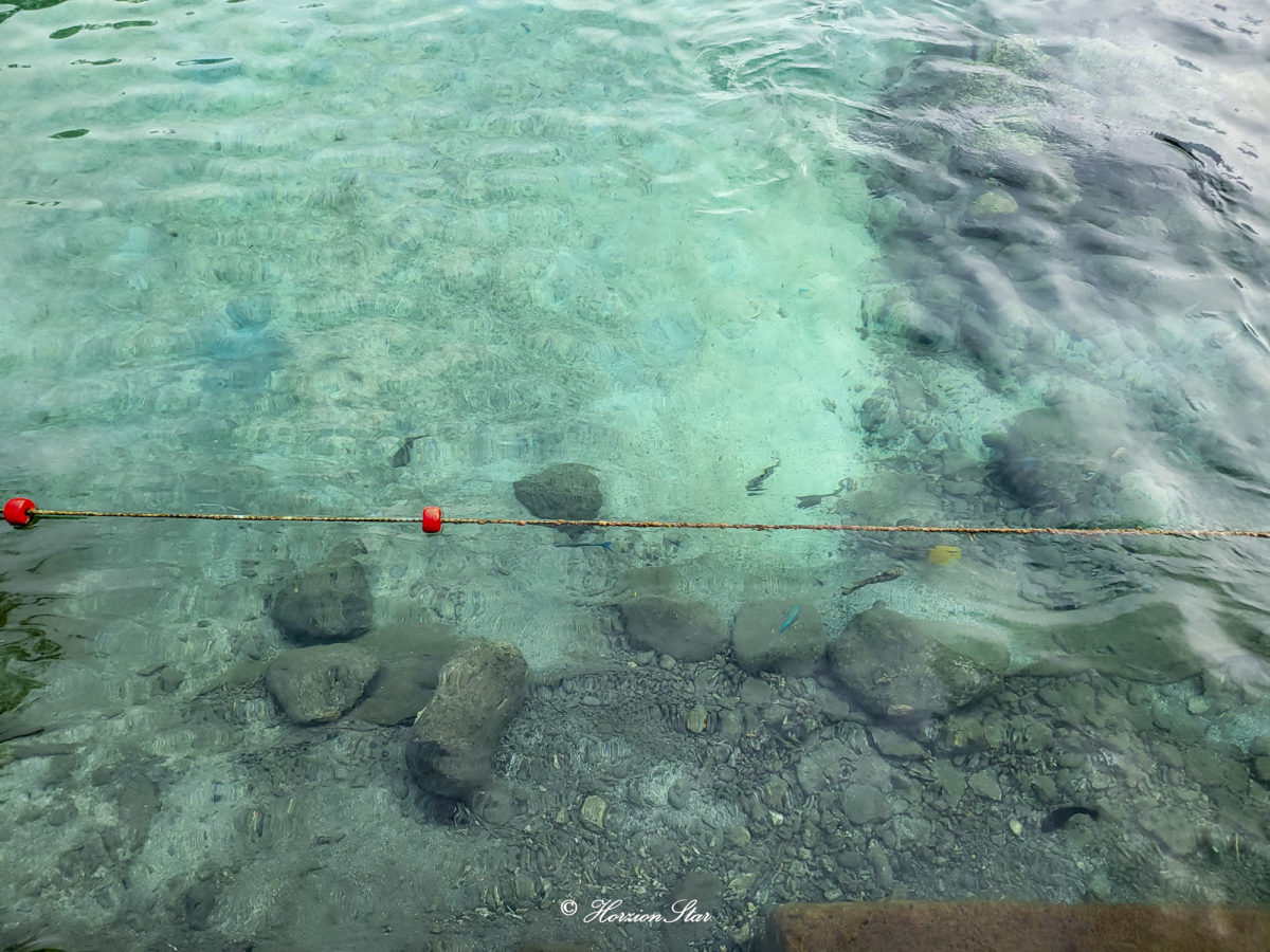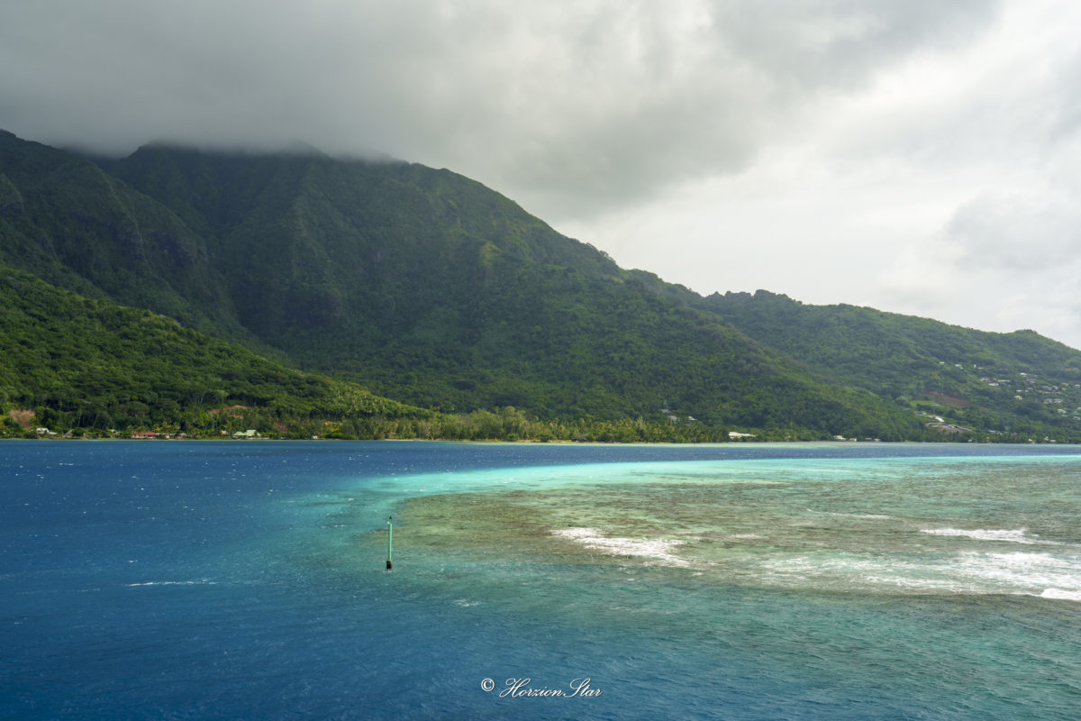 40分钟到了Moorea。快靠港的时候太阳蓦地钻出云层。时机不要太好,正好在轮船经过珊瑚礁的时候。两侧的浅滩给蓝色大海添上一抹亮色。