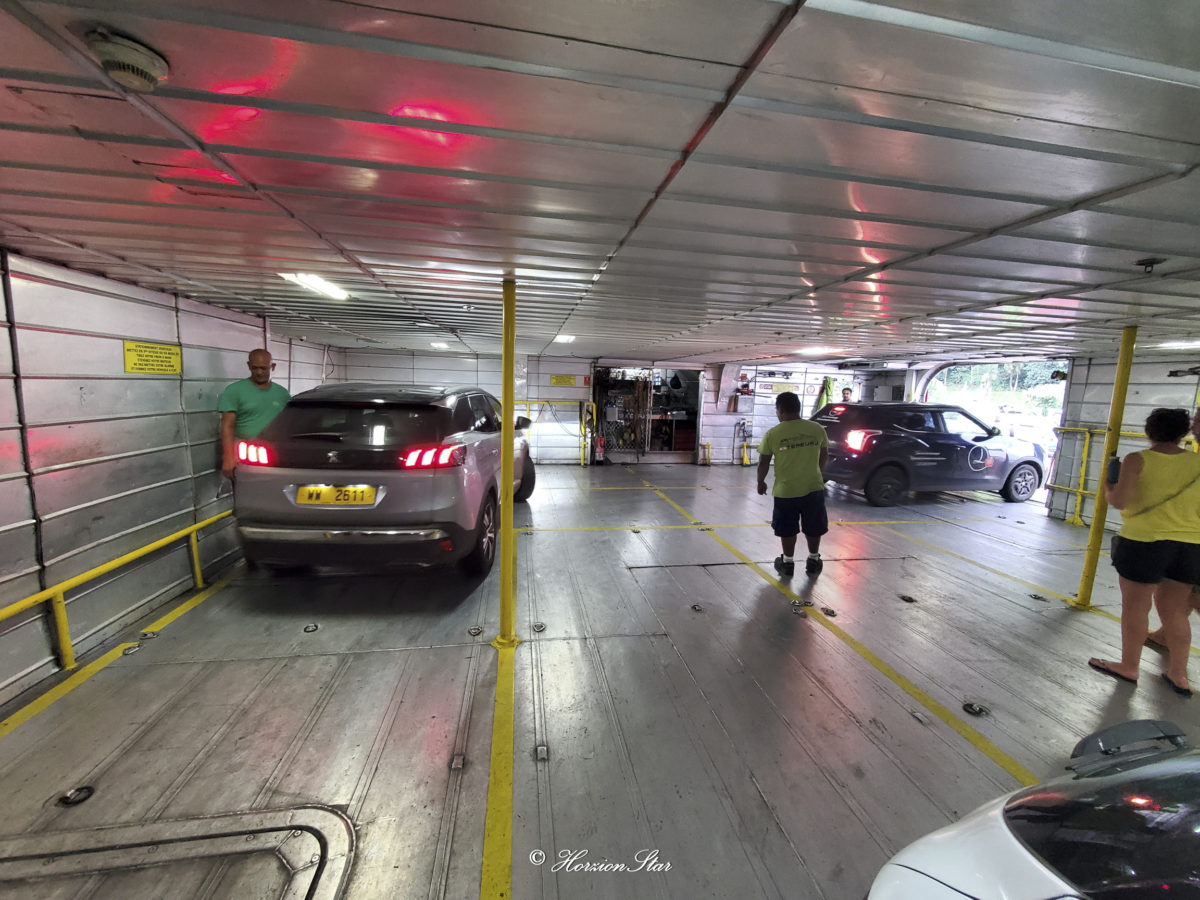 终于到了开船时间,大家也都来了。回去这趟是个小一点的船。所以停车空间非常的狭窄,一群指挥员指挥在哪里转弯,在哪里掉头,横着停,竖着停,正着停,倒着停,边缝填摩托车和自行车。拼凑七巧板一样把小空间停地密密麻麻的。走路都困难。