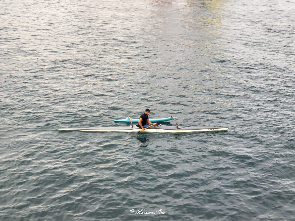 入Papeete港的时候,几个人划着划艇就冲轮船后面的掀起的急流就去了。一开始还以为他们被水流给吸引过来,替他们捏一把汗。没想到他们反而是过来蹭急流的,省点力气。好像骑自行车的扶着旁边开过的汽车一样。