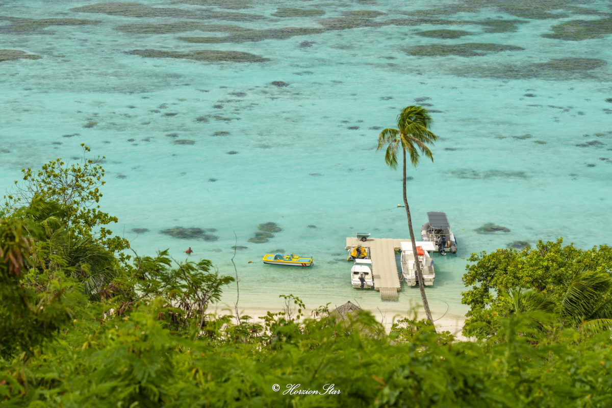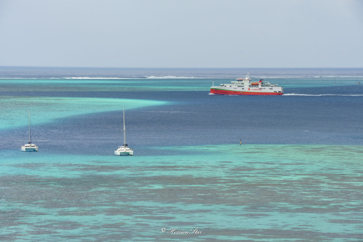 远处我们的轮船返航了,穿过珊瑚礁的缝隙,离开了Moorea。