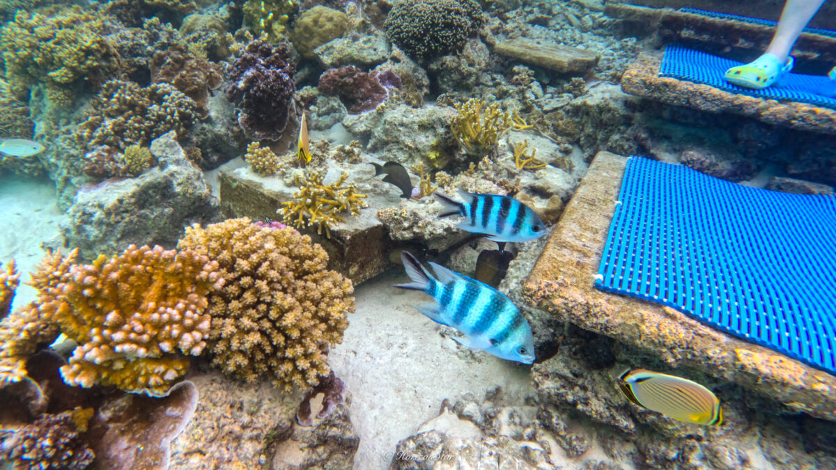 这次直接就游到了深水区,就是早晨看到的人工养育珊瑚的地方。在水中反而不如在岸边看到的那么清澈,水有些浑浊。