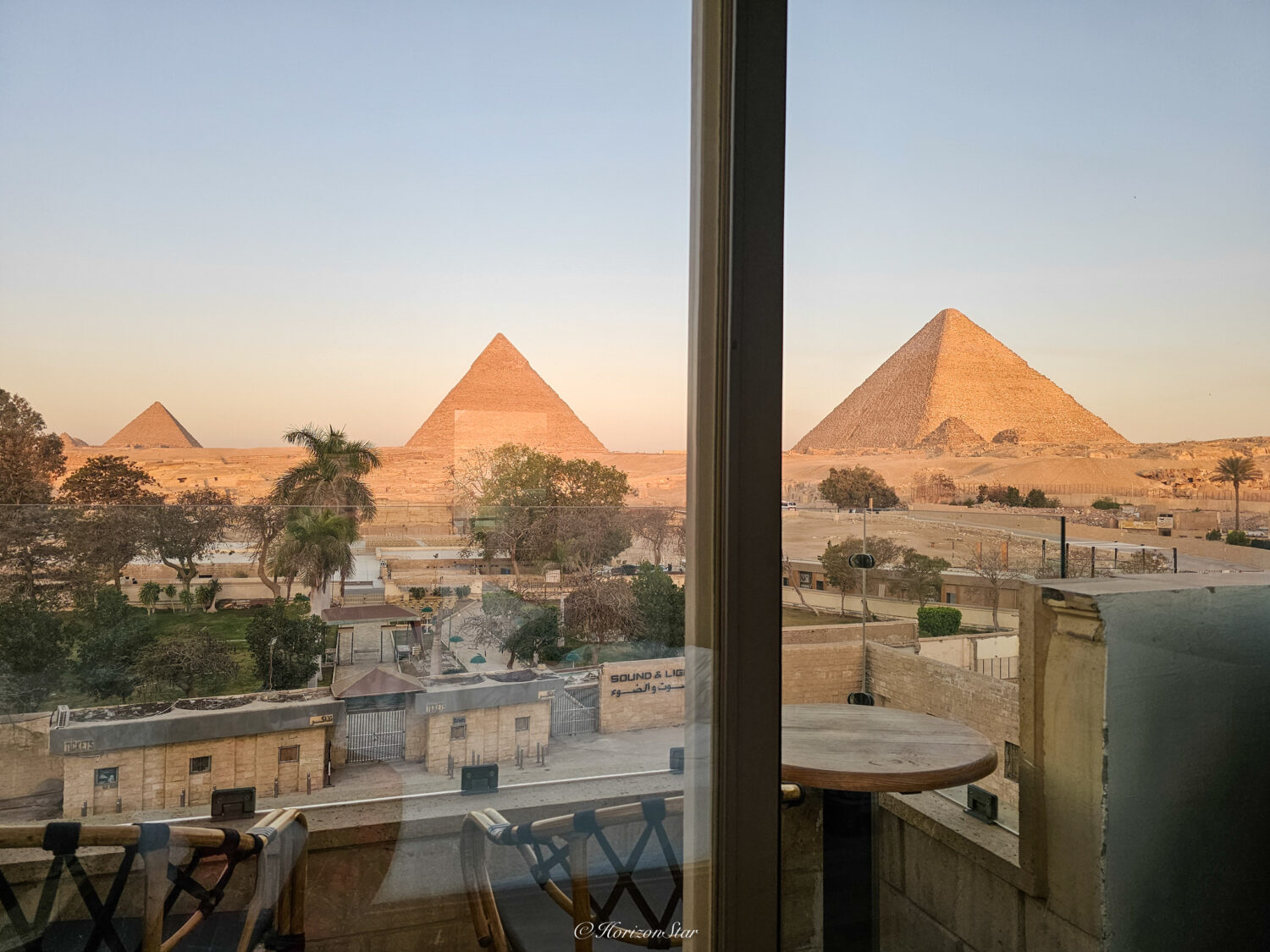 拉开窗帘,就看到了金字塔在眼前。这就是这家酒店最棒的地方,也是我们选他的原因,在床上就能看到金字塔。