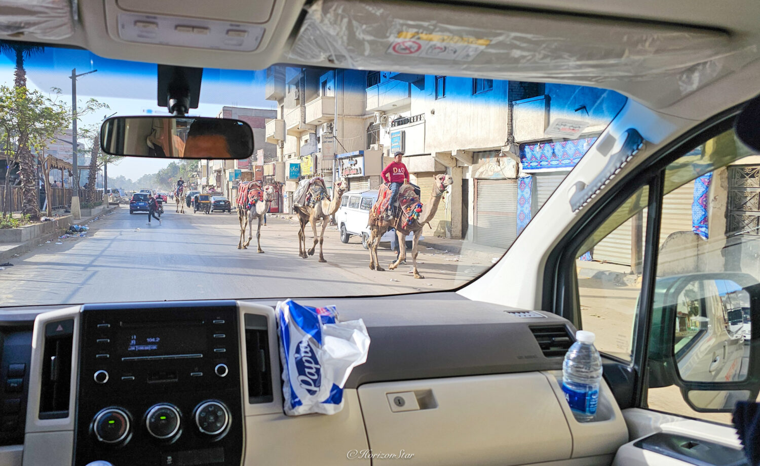 一路在混乱的街道,拥挤的交通中开往金字塔北门。