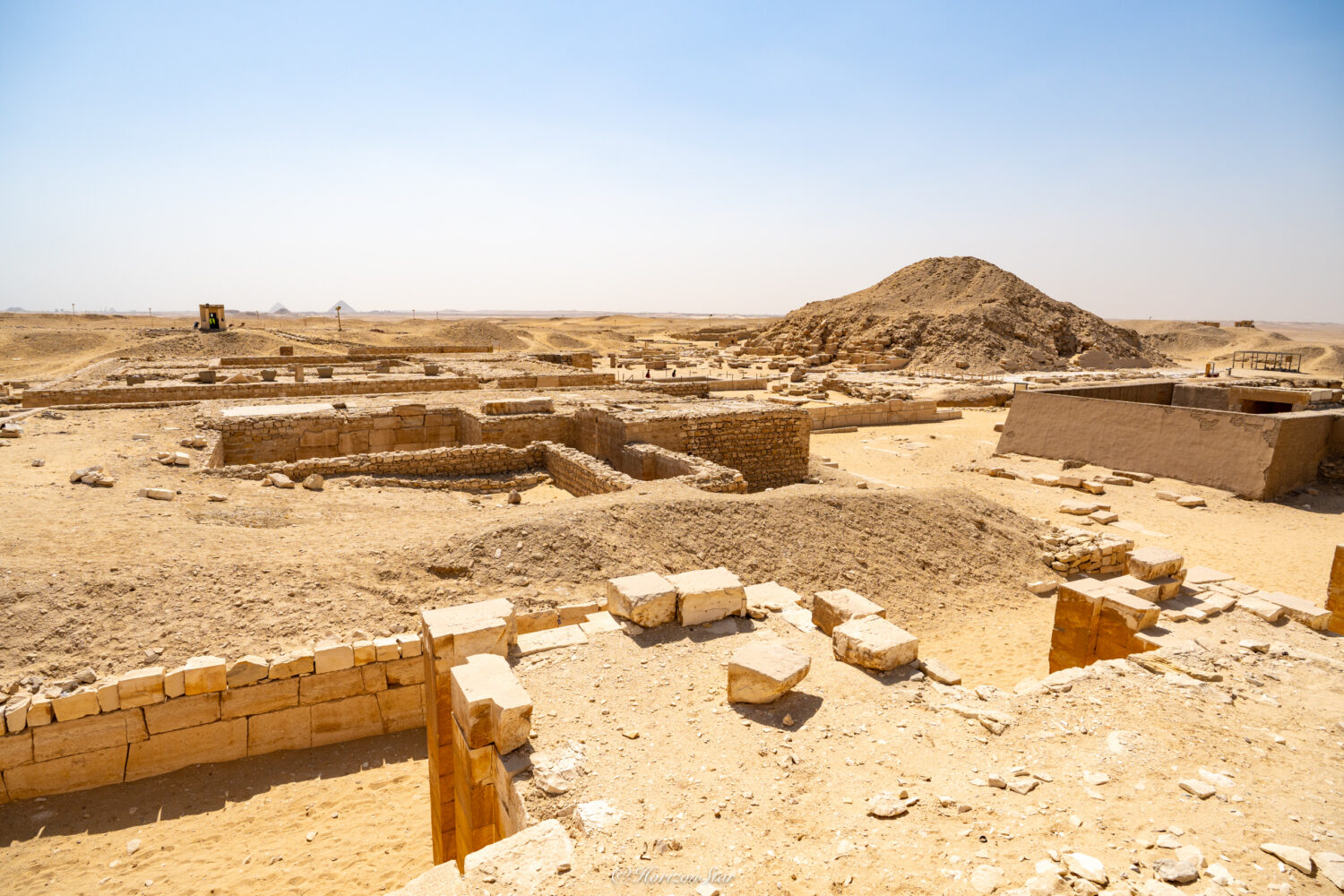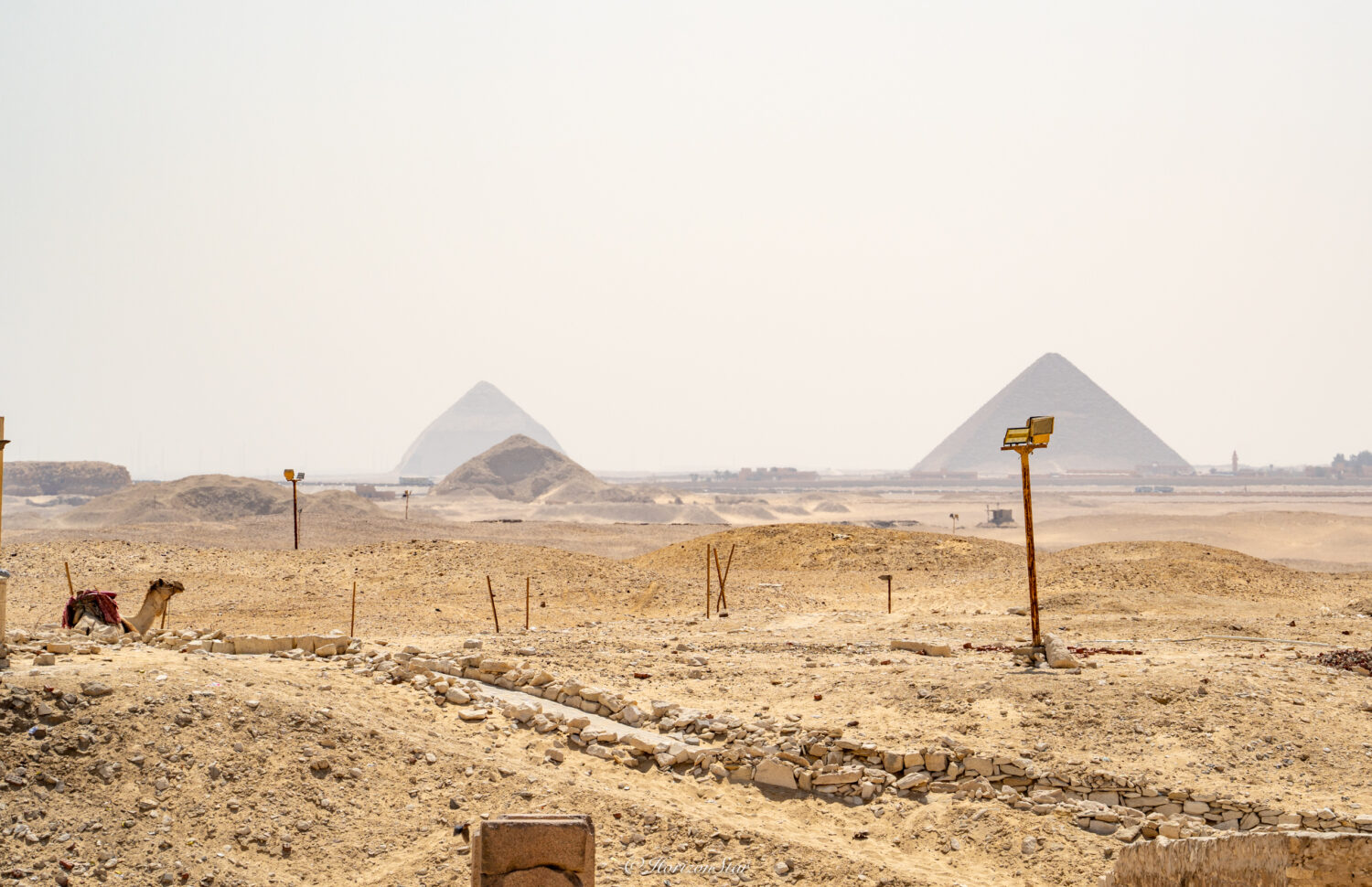 很远处,可以看到弯曲金字塔以及右边的红色金字塔。都是金字塔建筑的里程碑。离得近的那个是垮掉的Pepi II的金字塔。