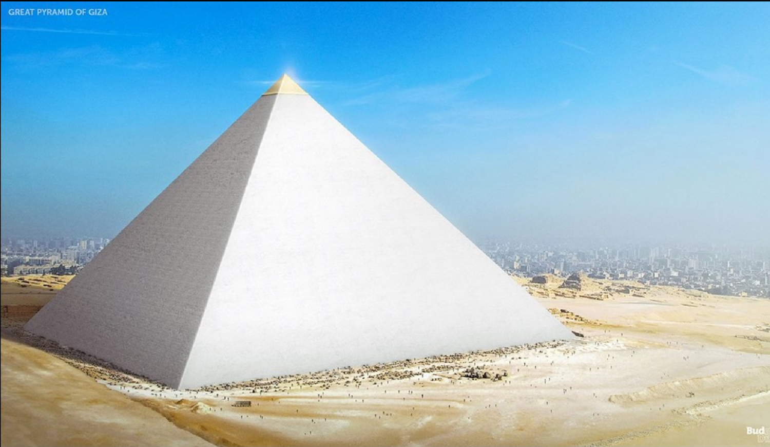 如果能继续往回穿越时空,到达4500年前,也就是公元前2600年,刚建成的金字塔是一个更加让人震撼的庞然大物。它通体洁白,是不可计数的工人们一点点把石灰石整齐的切割,打磨,甚至抛光。而顶端则是用黄金贴片。整个金字塔在埃及的阳光下熠熠发光,真正意义上的神的建筑,几百公里外就会看到。