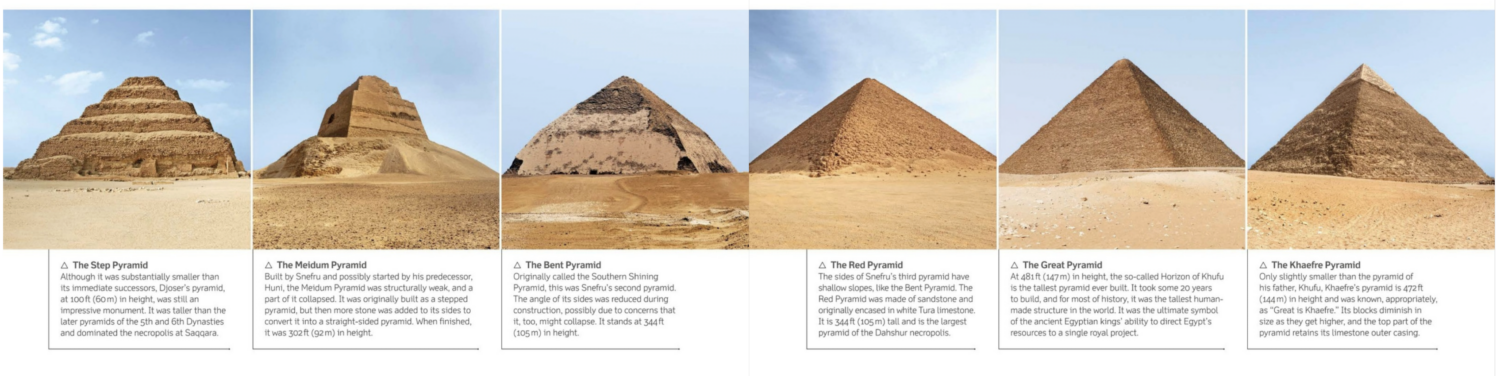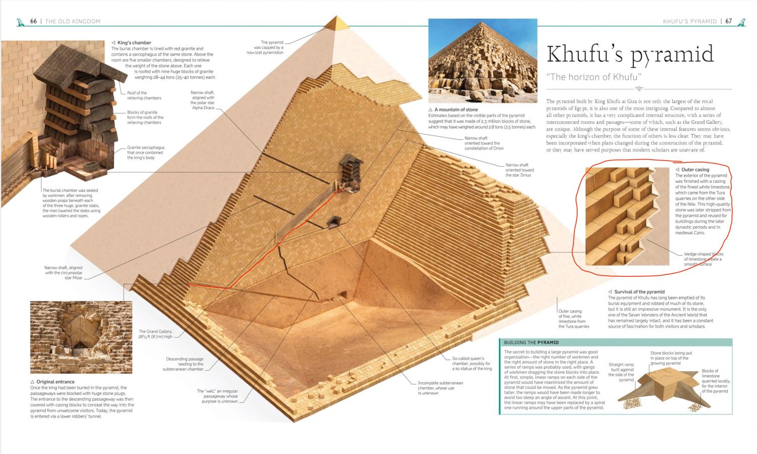 下面一页截自《Ancient Egypt: The Definitive Visual History》一书,这本书也是去埃及前的推荐读物,很翔实的介绍了埃及的各种文化古迹以及文物。下图的右侧中间位置,可以看到金字塔外墙的结构图。以及现在可以买票走进金字塔的通道。通道入口是一个盗洞。