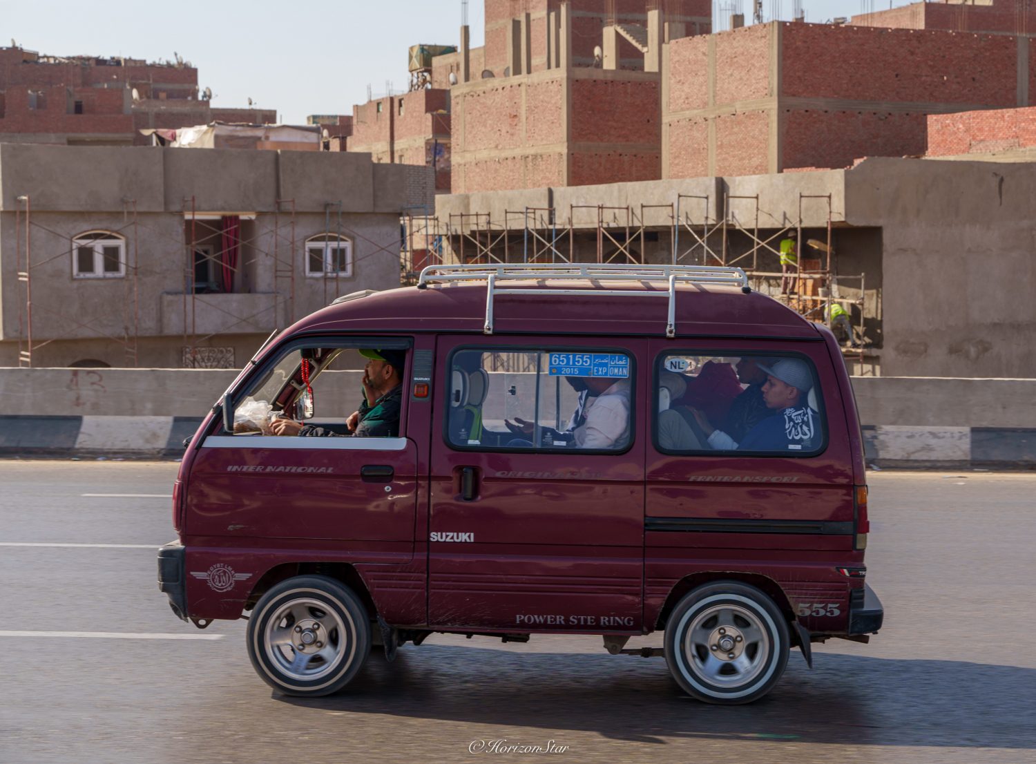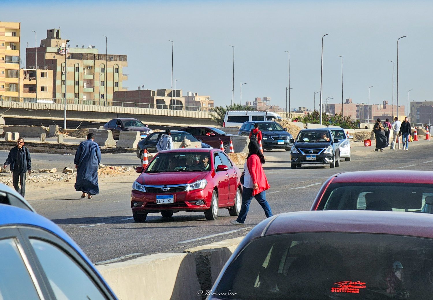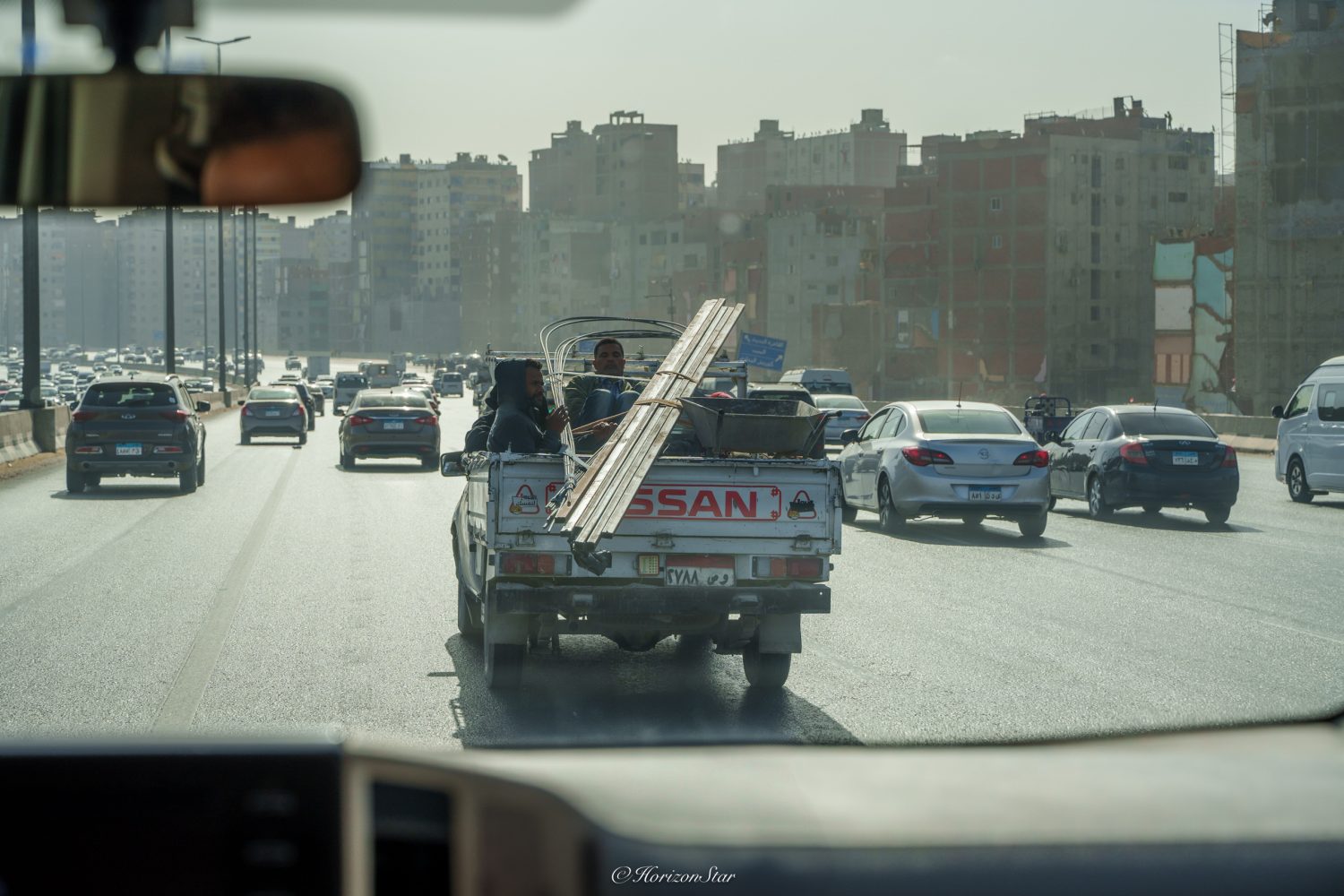 对面方向有辆小红车,快速的在高速倒车几百米,然后垂直插到对面的和我们同向的车流。问题是高速对面为什么会有和我们同向的车流。反正埃及的交通和金字塔一样扑朔迷离。