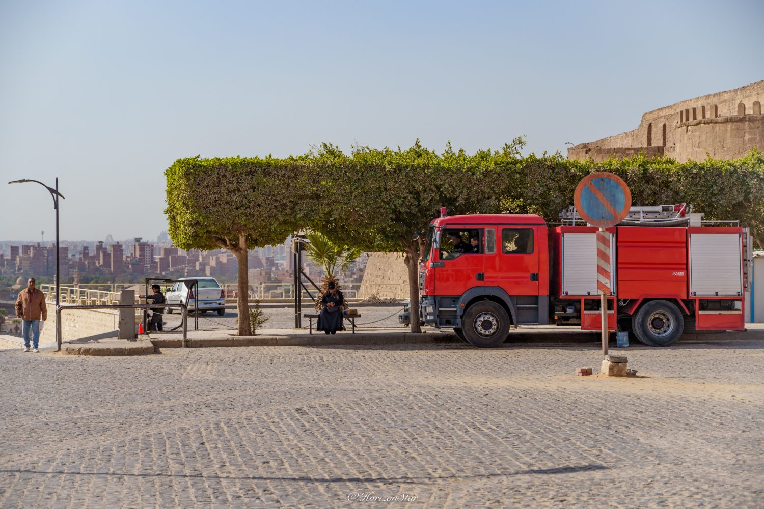 城堡门口停着一辆救火车,随时准备救援。但是这石头城堡看着也点不起火来。不管了,反正埃及就是一个谜。
