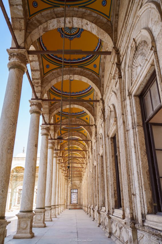 清真寺外墙的石头深浅不一。暗一点的黄色的石头就是从金字塔上面搬过来的。下面白色的墙就是雪花石。因为这个清真寺大量地使用了雪花石,因此也被称为雪花石清真寺。