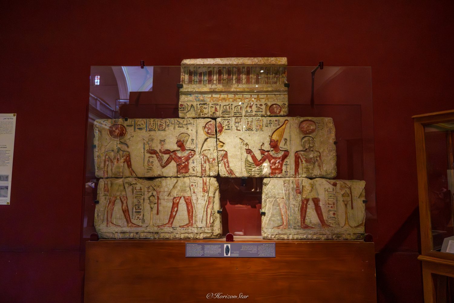 赶紧看看拍的旁边的另一幅石雕。至少画风是正常的。看看下面的介绍牌:托勒密一世给鹮鸟头神和狒狒头神进献。这个是正八经的埃及古文物了。