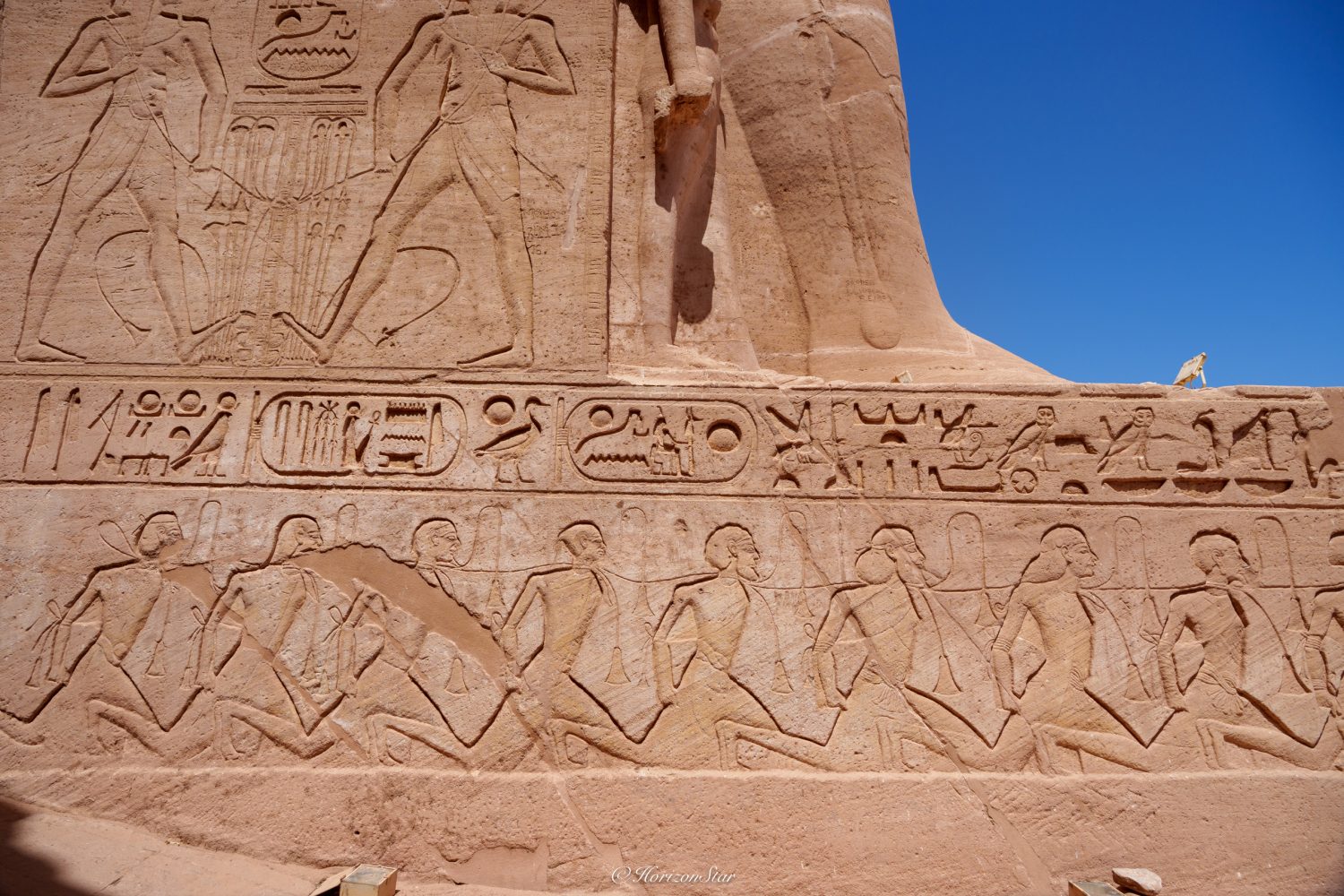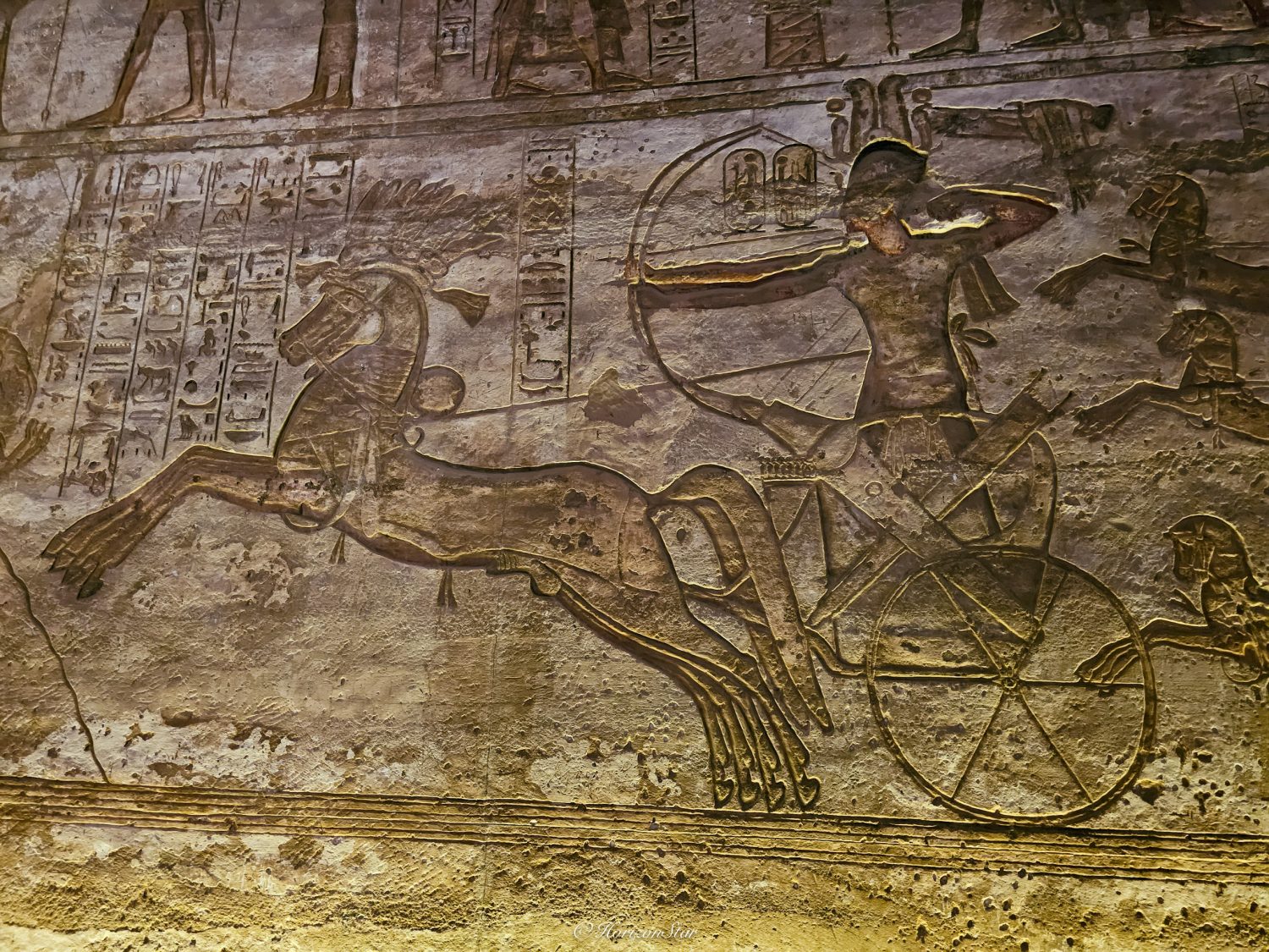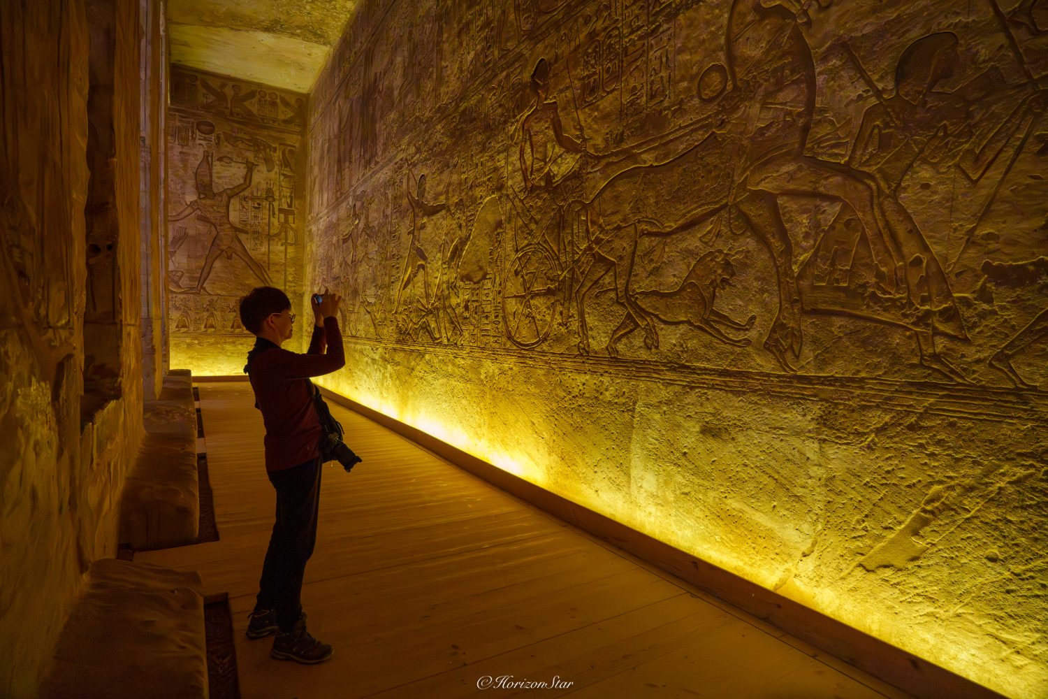 立柱石像的后面墙壁上,刻满了拉美西斯的丰功伟绩,战争中天神般的勇武,割下敌人头颅的残酷,宽恕敌人俘虏的仁慈,对25分之一的老婆的爱恋,对儿女的慈爱,对创世神阿蒙和对太阳神拉的虔诚。种种事迹,向世人展示。