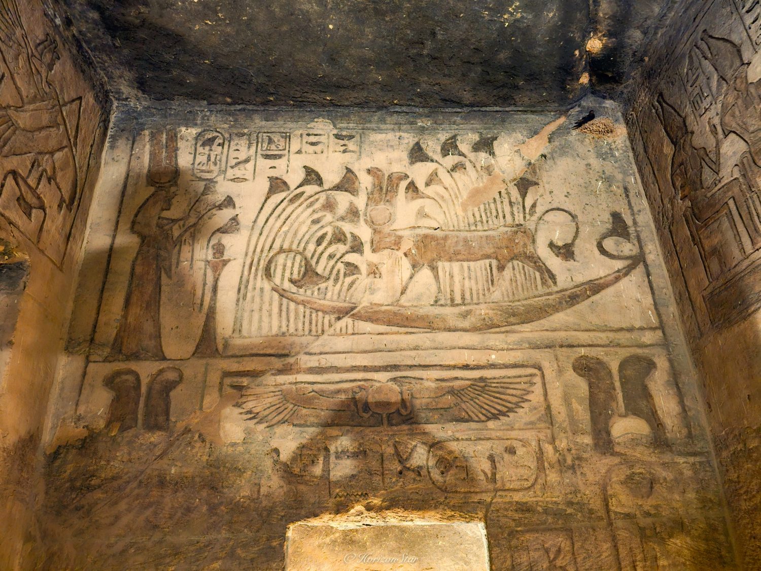 女神哈索尔经常以牛的形象出现,或者头顶着牛角。神庙尽头的壁画上,王后在河边设立祭坛,一头女神乘着轻舟,在尼罗河畔青纱帐般浓密的莎纸草中显现身影。