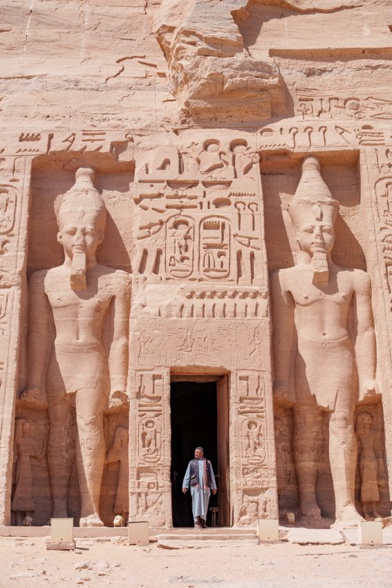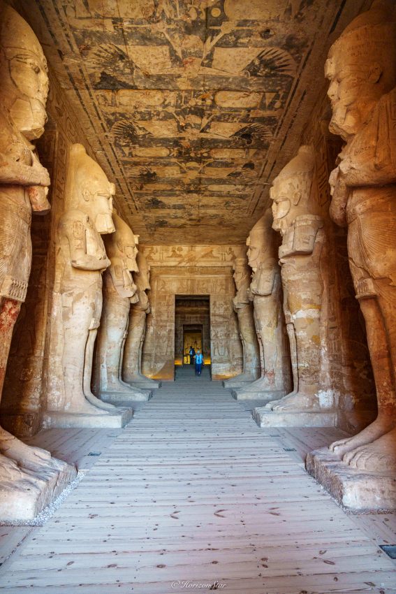 大门的两侧的六个石雕,四个拉美西斯,两个他的正宫Nefertari像。左右都是两拉一奈,王后摆中间。