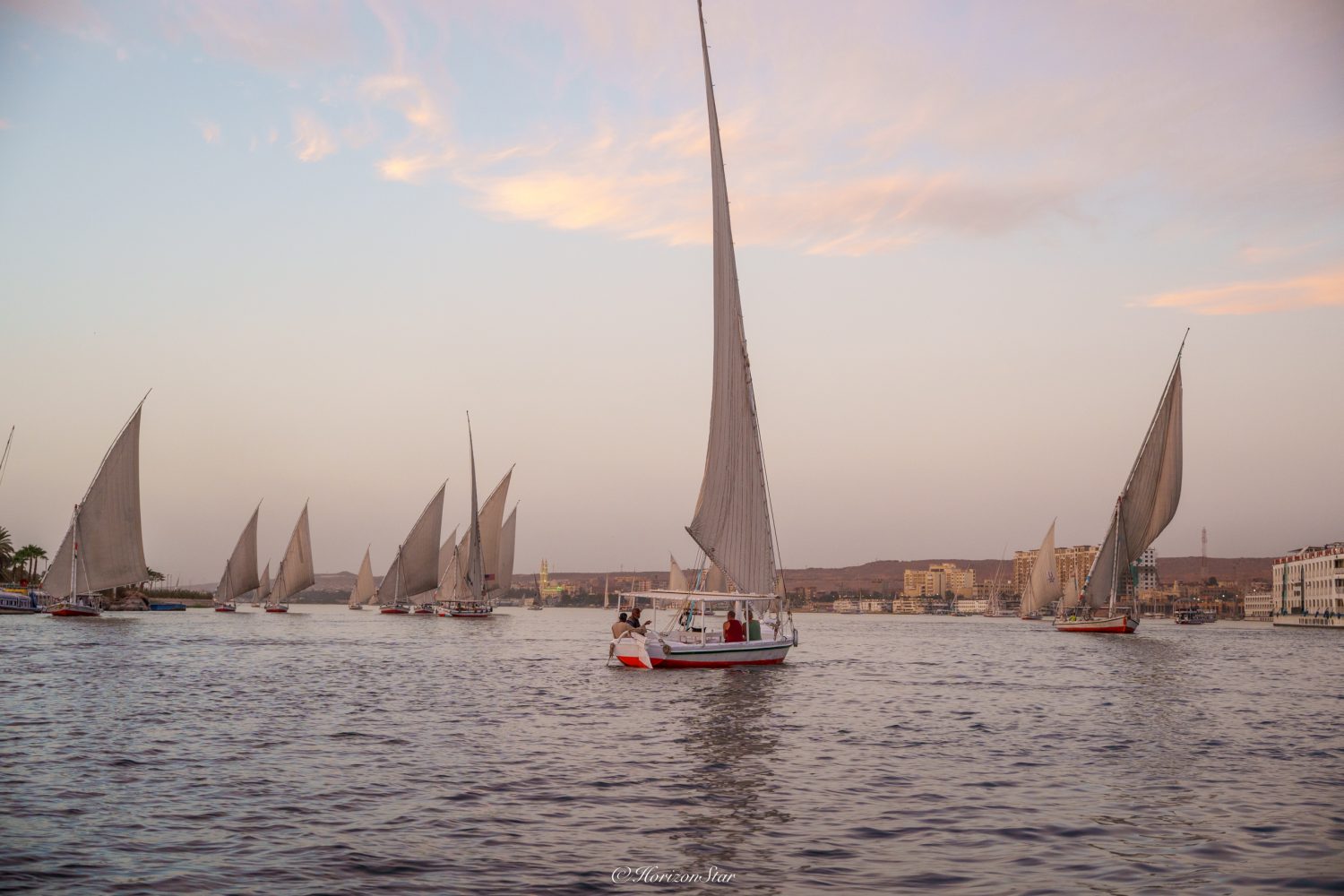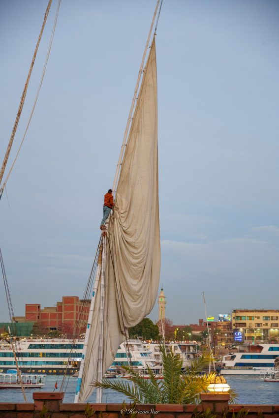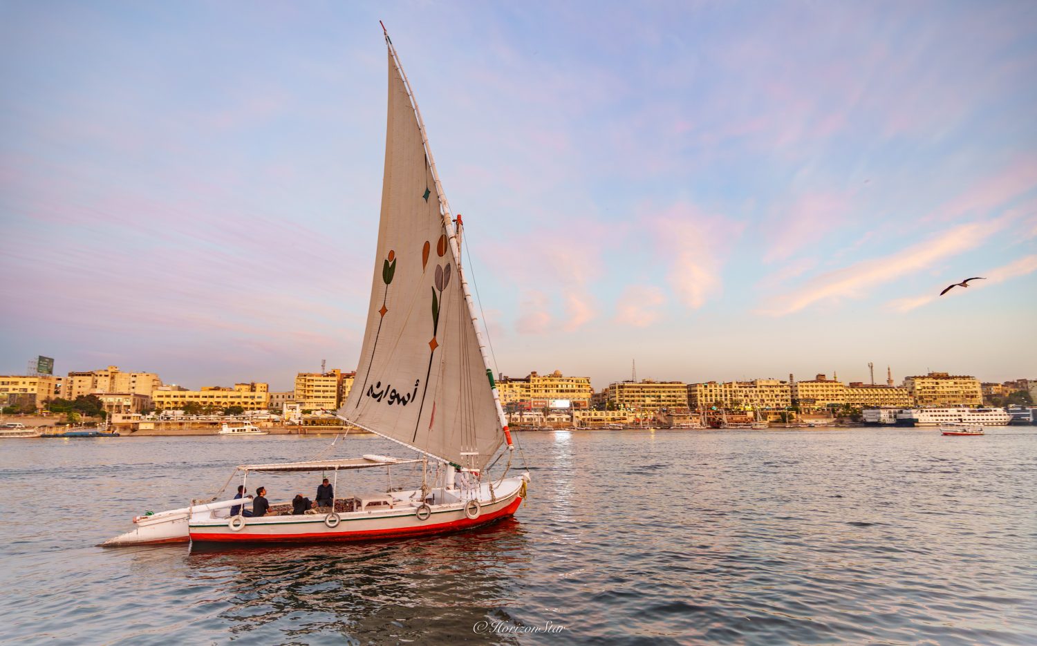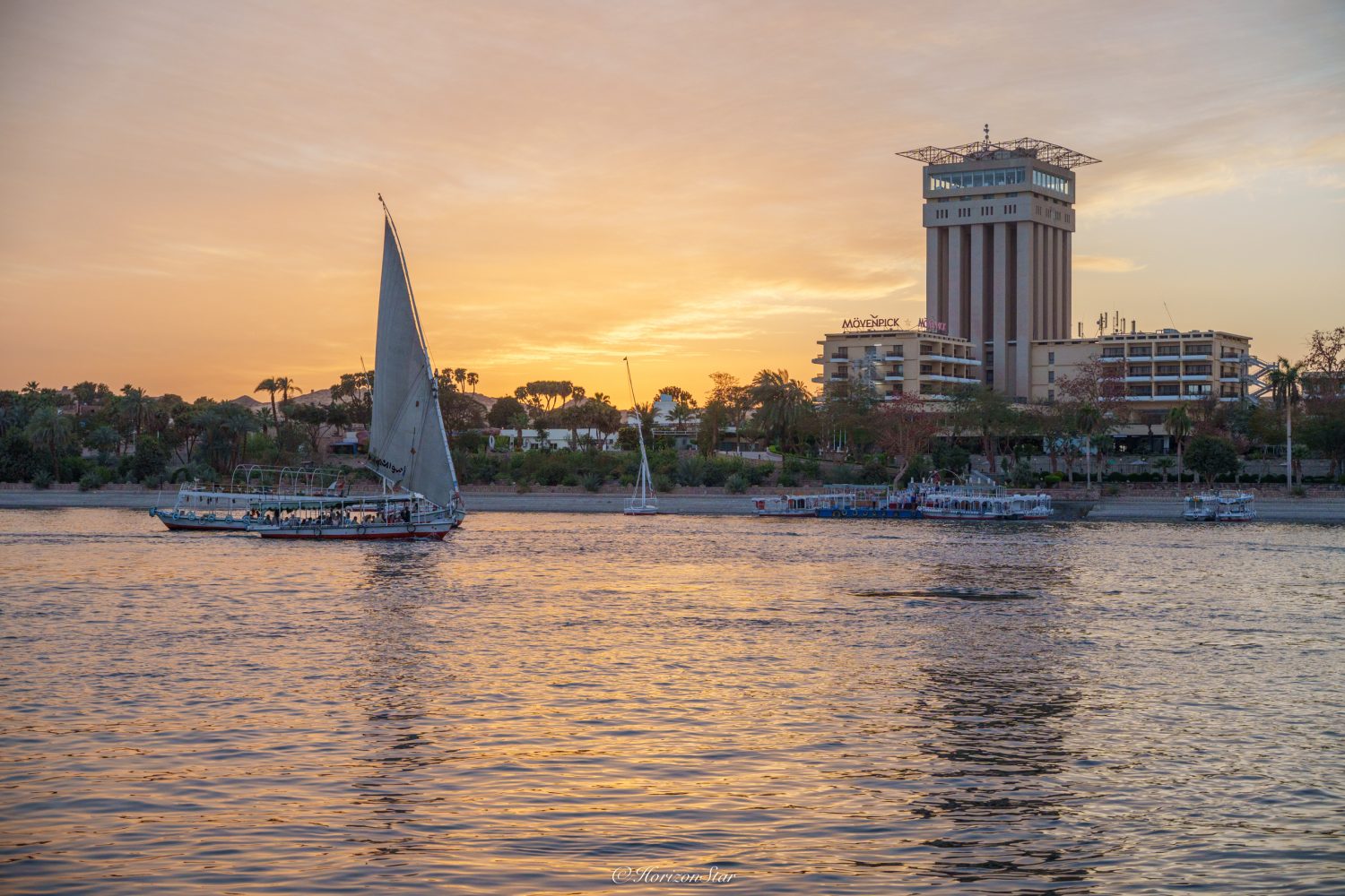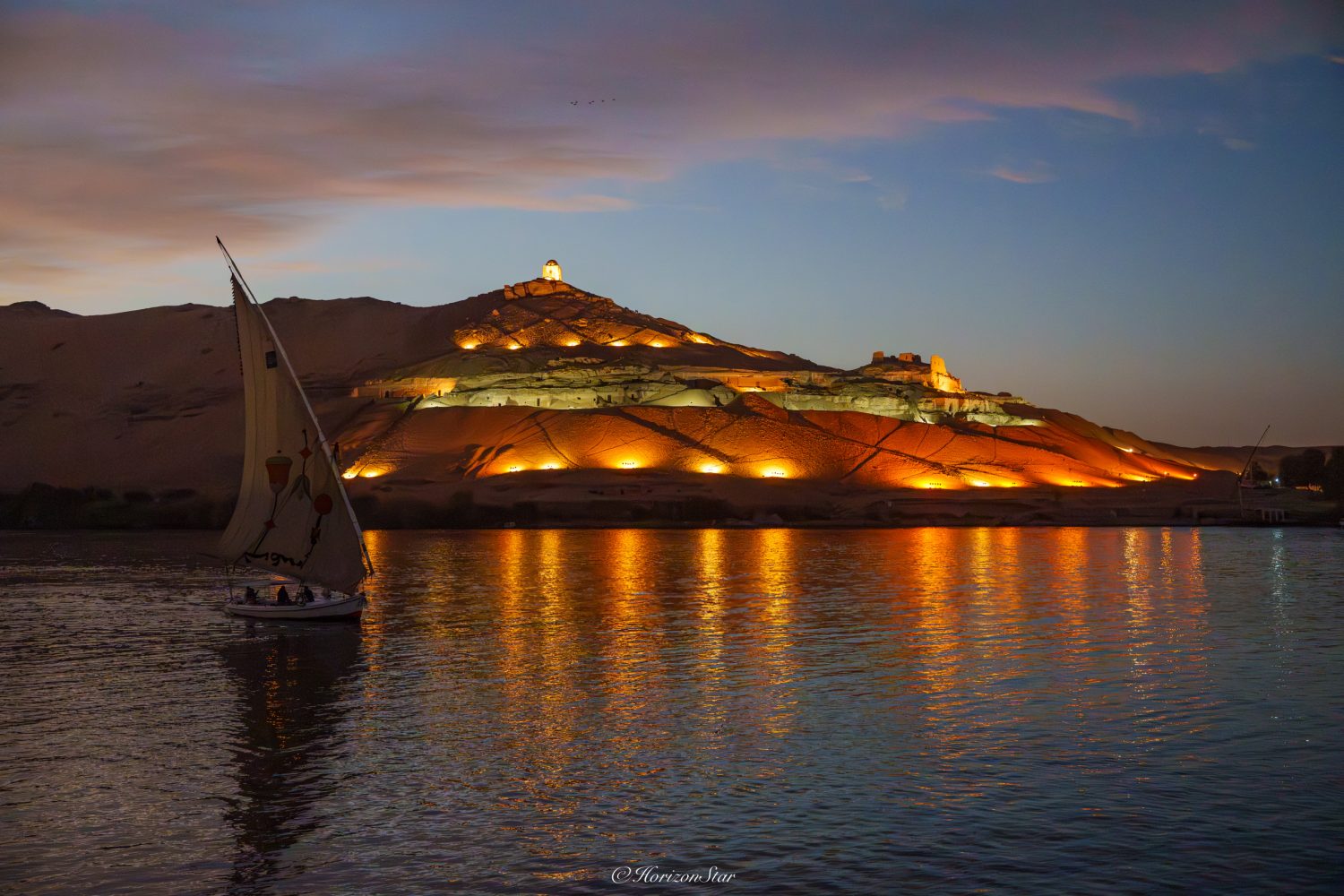夜幕已经降临。河对岸的皇陵也亮起了灯。在尼罗河上航行了千年的大帆船,经过了几千年的陵墓