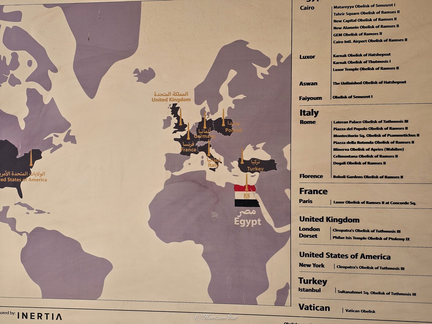 全世界的方尖碑全都是埃及赠送的。本土之外,最多的就属意大利了。从搬迁埃及博物馆到搬迁菲莱神庙,全是意大利公司来说,意大利也是理所当然的被赠予的最多。本来以为美国华盛顿特区的方尖碑是埃及赠予的,但是查了一下,那个是美国人受埃及启发,自己做的。但是纽约中央公园的方尖碑是埃及赠送的,名字叫“克丽奥佩特拉的针(Cleopetra’s Needle)”,不知是指凯撒还是安东尼。