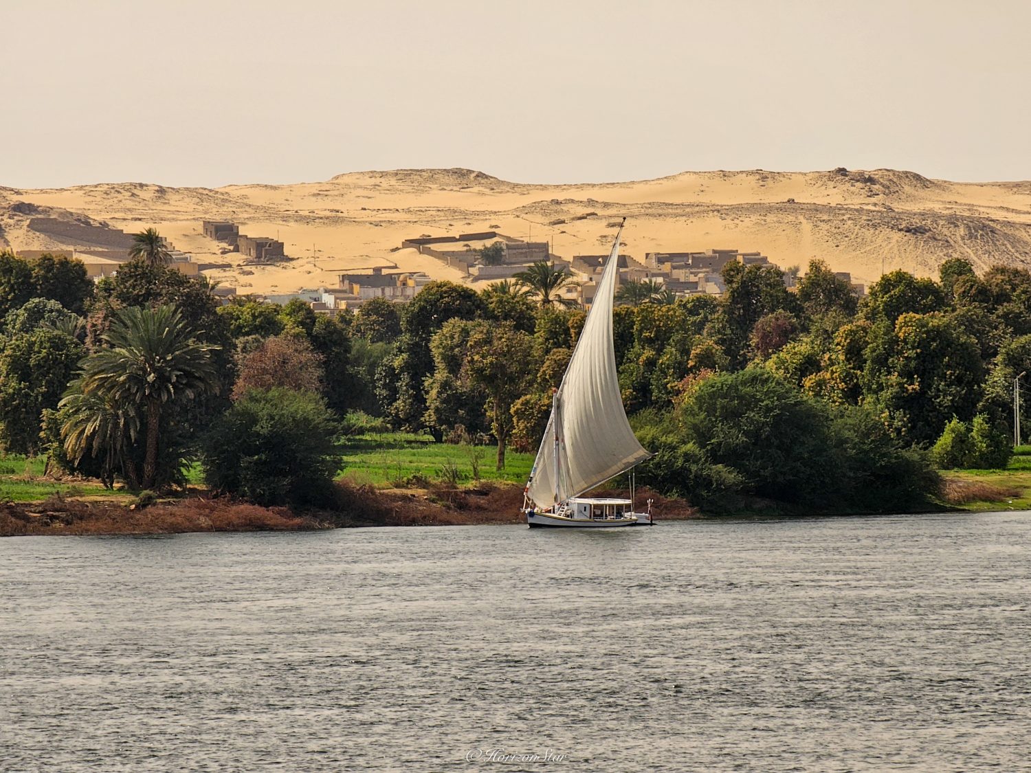 尼罗河对岸的农田被浓密的树林保护起来,阻挡着来自撒哈拉沙漠的沙丘