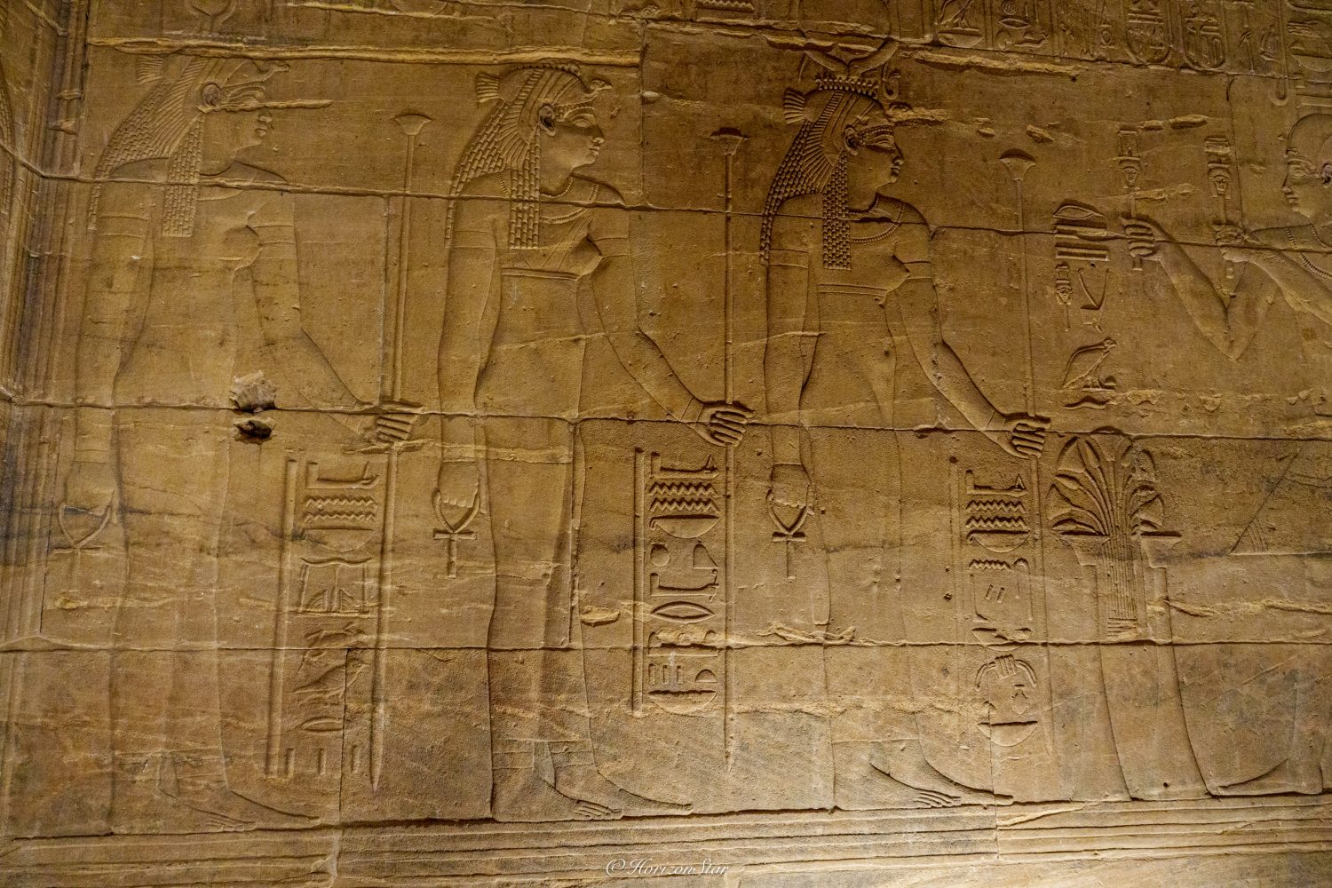 这个神庙供奉的是女神哈索尔,还有矮神贝斯。因为哈索尔不仅主管着生育,还与兼职快乐,舞蹈,音乐。而贝斯主管家庭儿童的保护和娱乐。所以这个神庙两个神就放一起了。壁画也都是欢乐的样子。