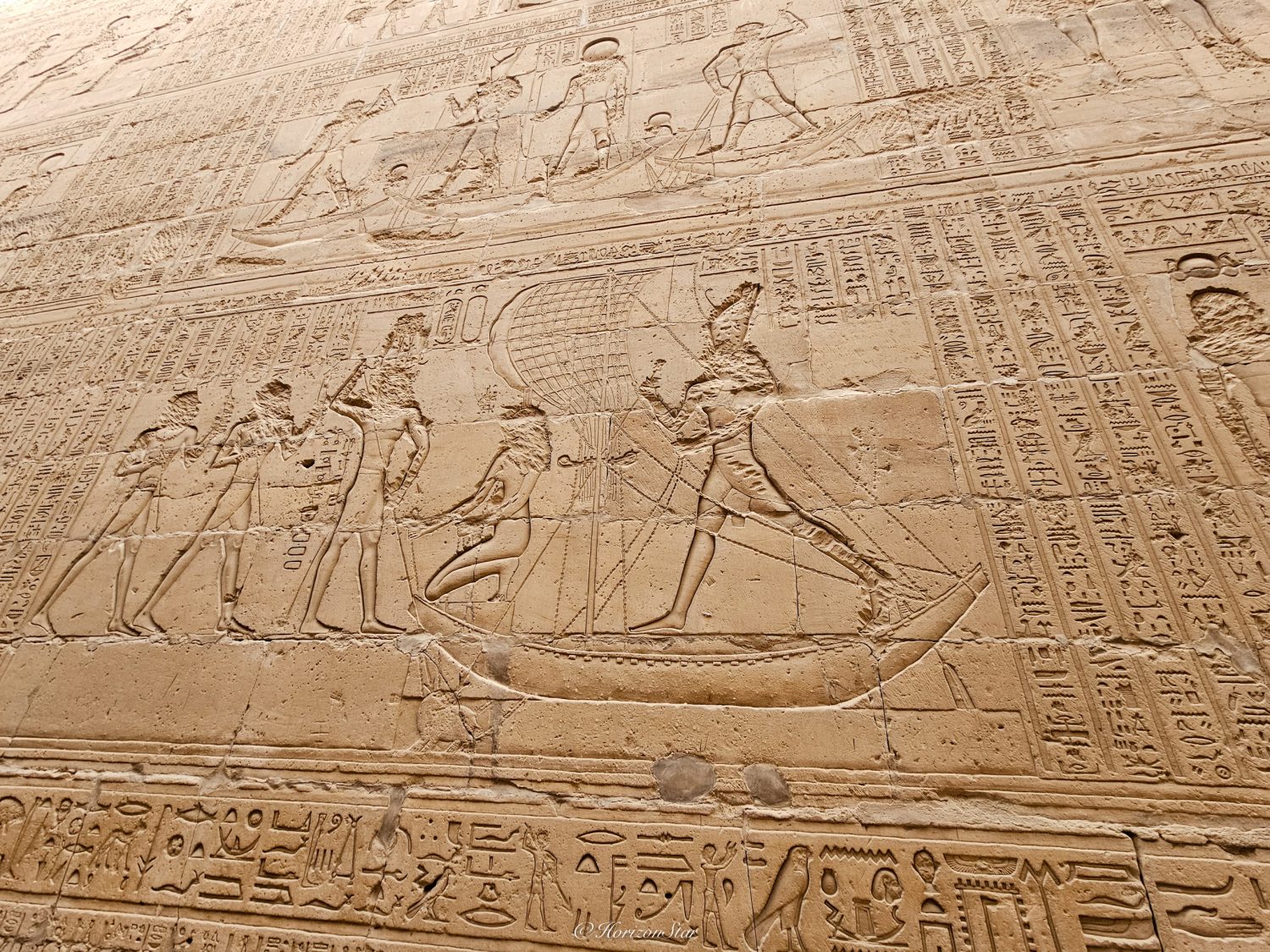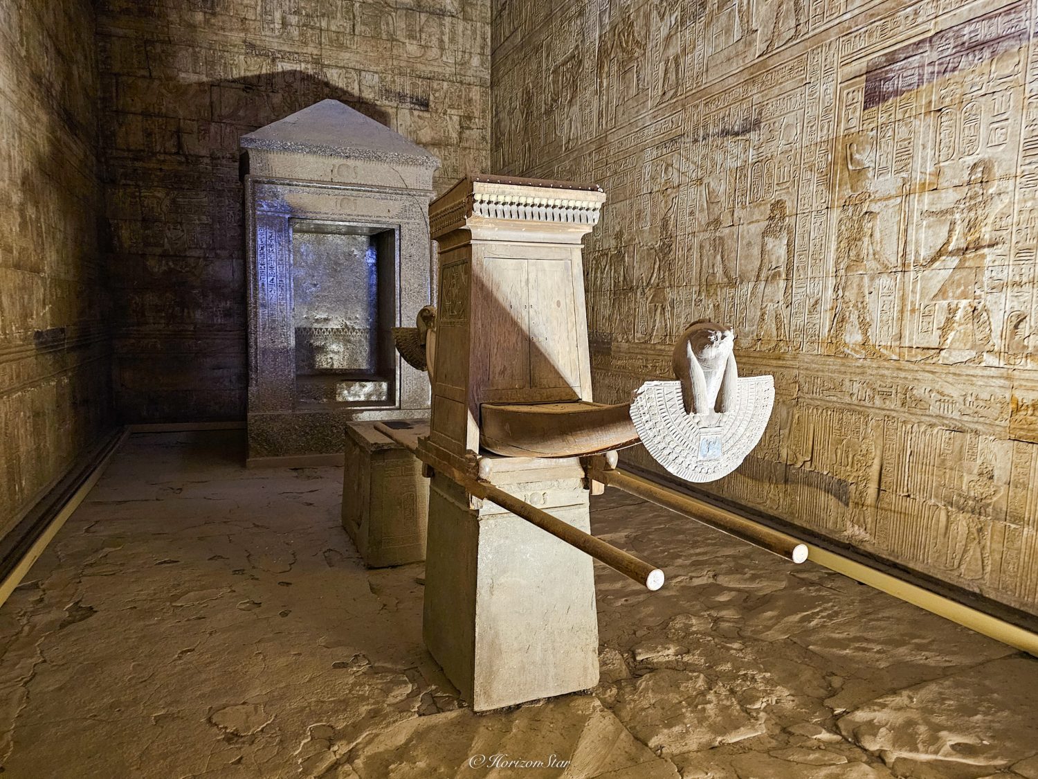 这个轿船在祭祀的时候,会被抬到神庙顶上,象征着荷鲁斯走过的足迹。摆在这里的是现代的复制品。