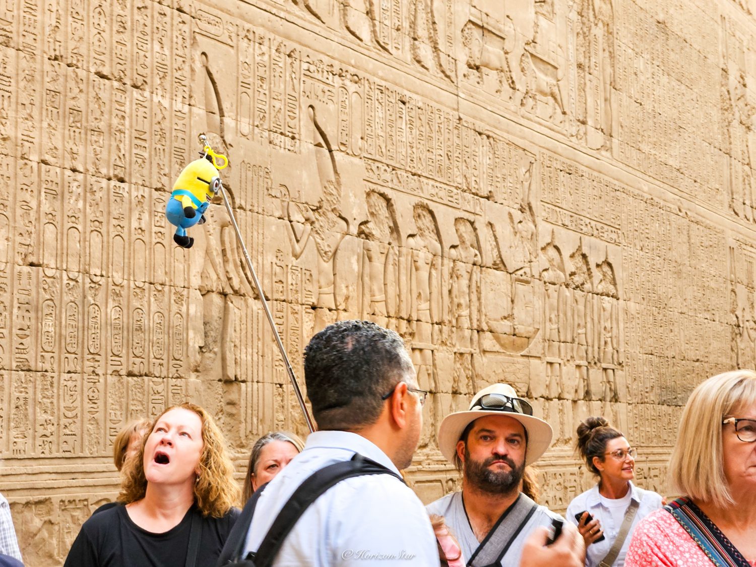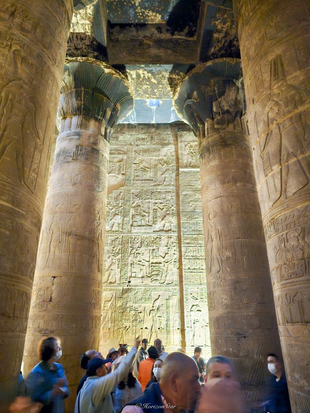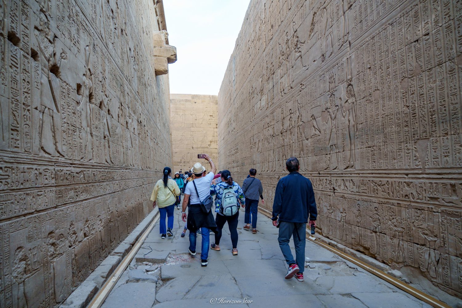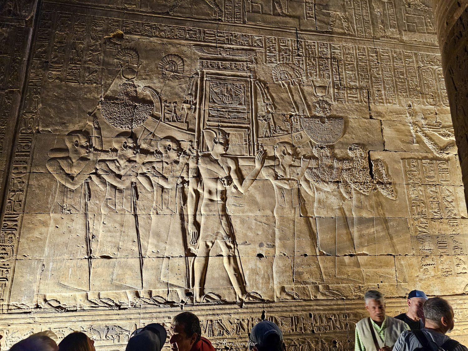 导游很清楚今天会有千军万马冲神庙,所以昨晚特意嘱咐我们,一进门趁着人少,直杀内殿,从里往外参观。于是秉持着他的要求,直接往内殿跑。但是不要小瞧了埃及,所见略同的英雄们不在少数,结果到内殿的时候,荷鲁斯的轿船已经给围的水泄不通了。