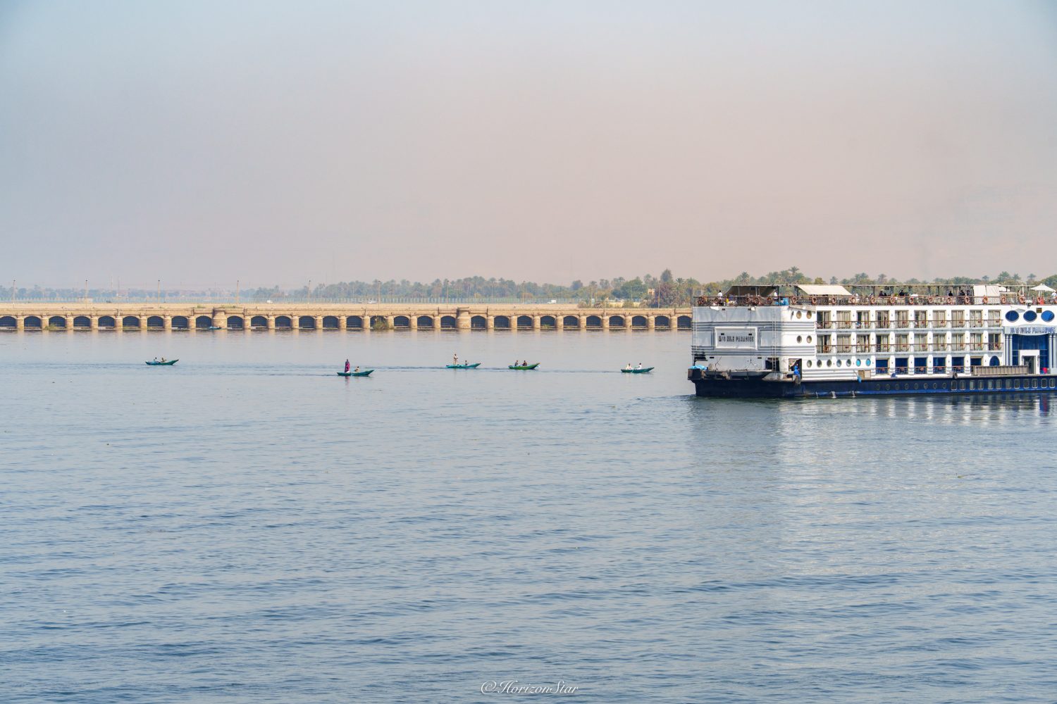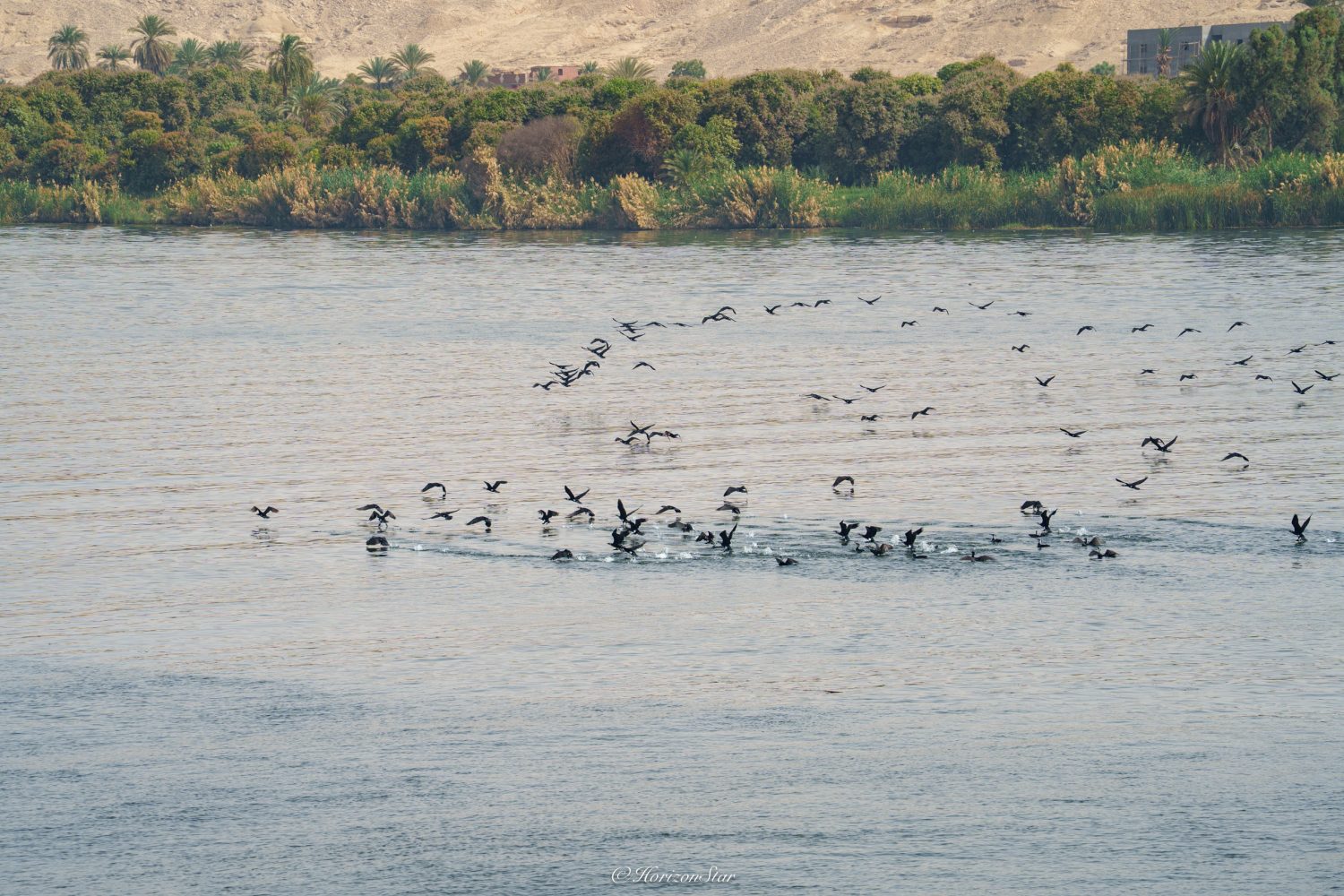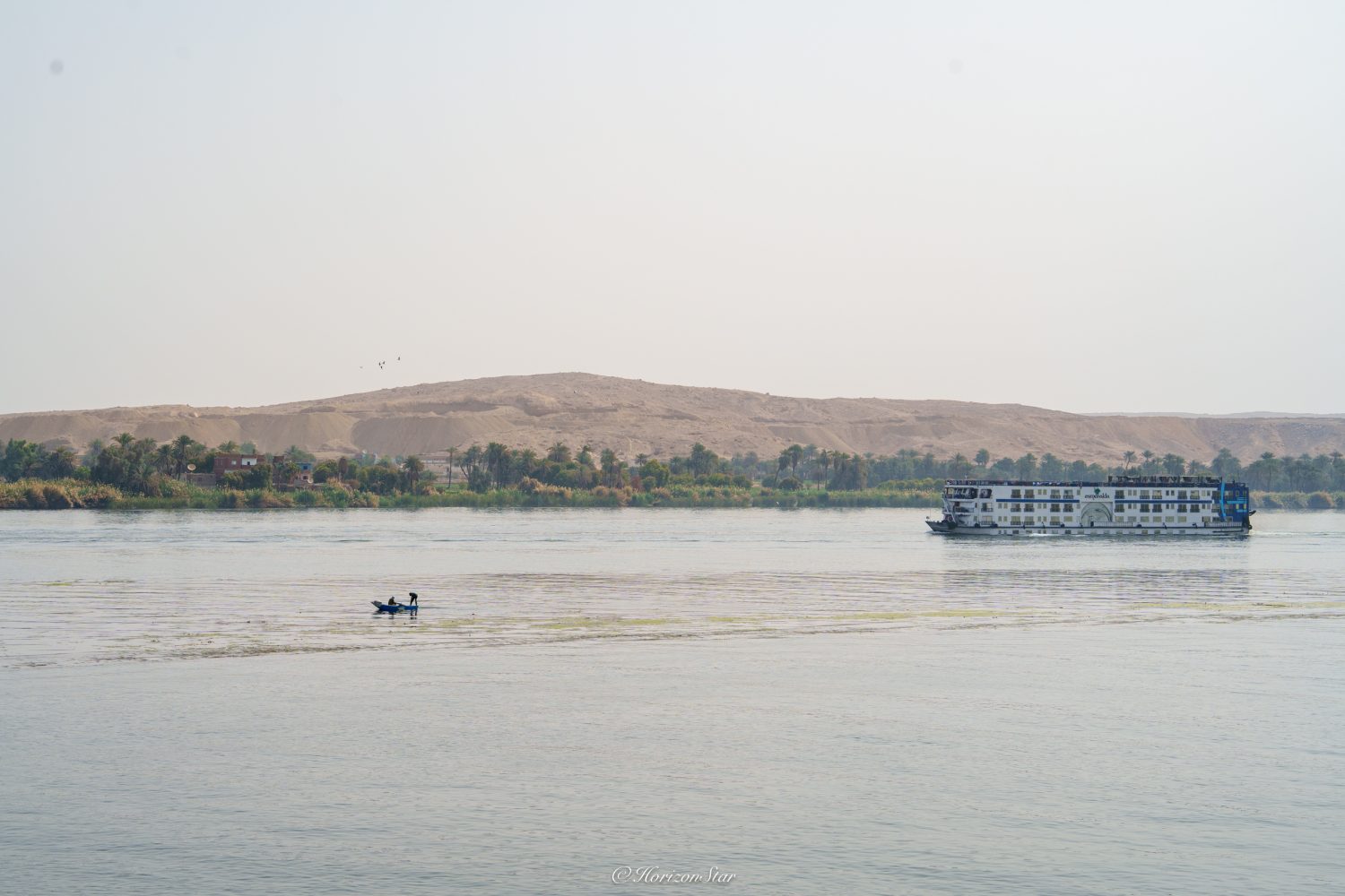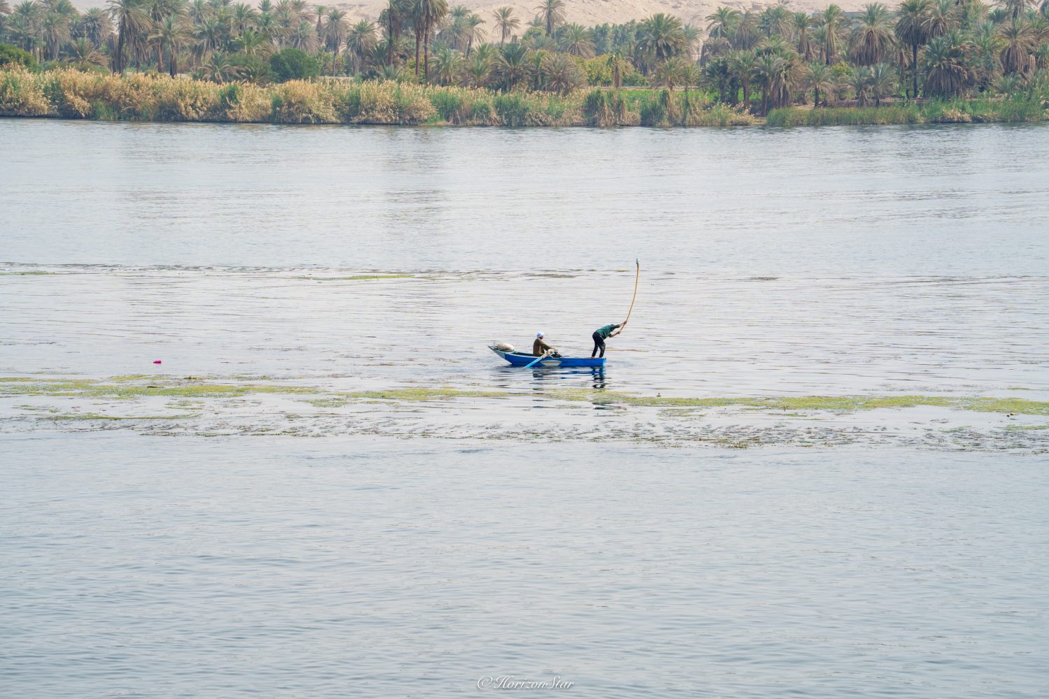 一缕浅滩把尼罗河一分为二,竞赛的游轮在两侧深水区,中间的浅水区就有渔夫在打鱼。