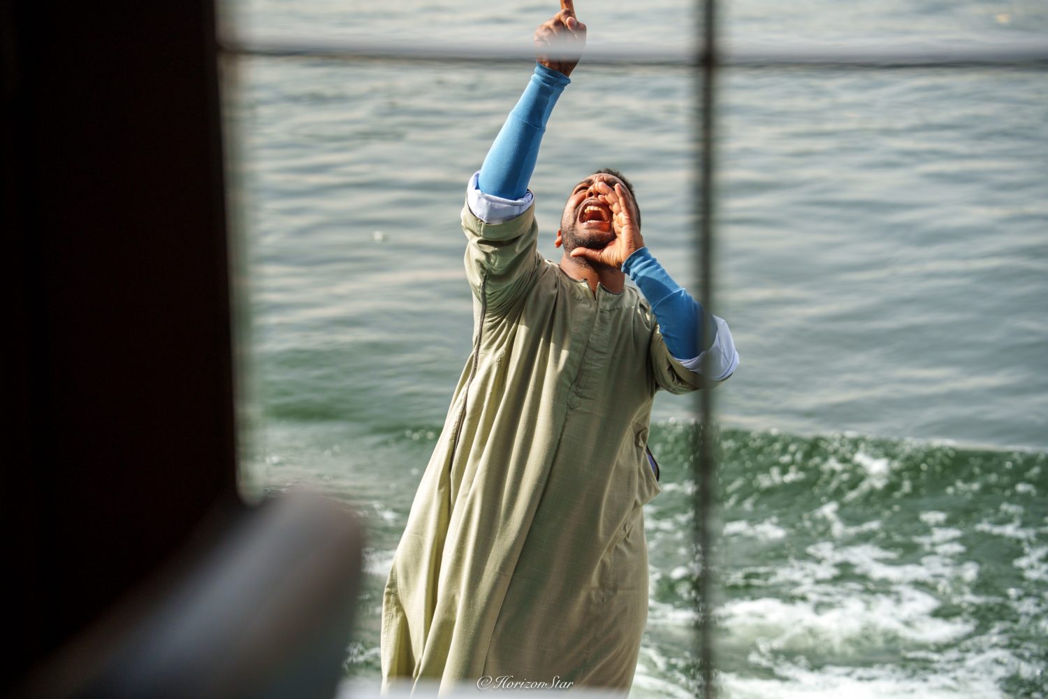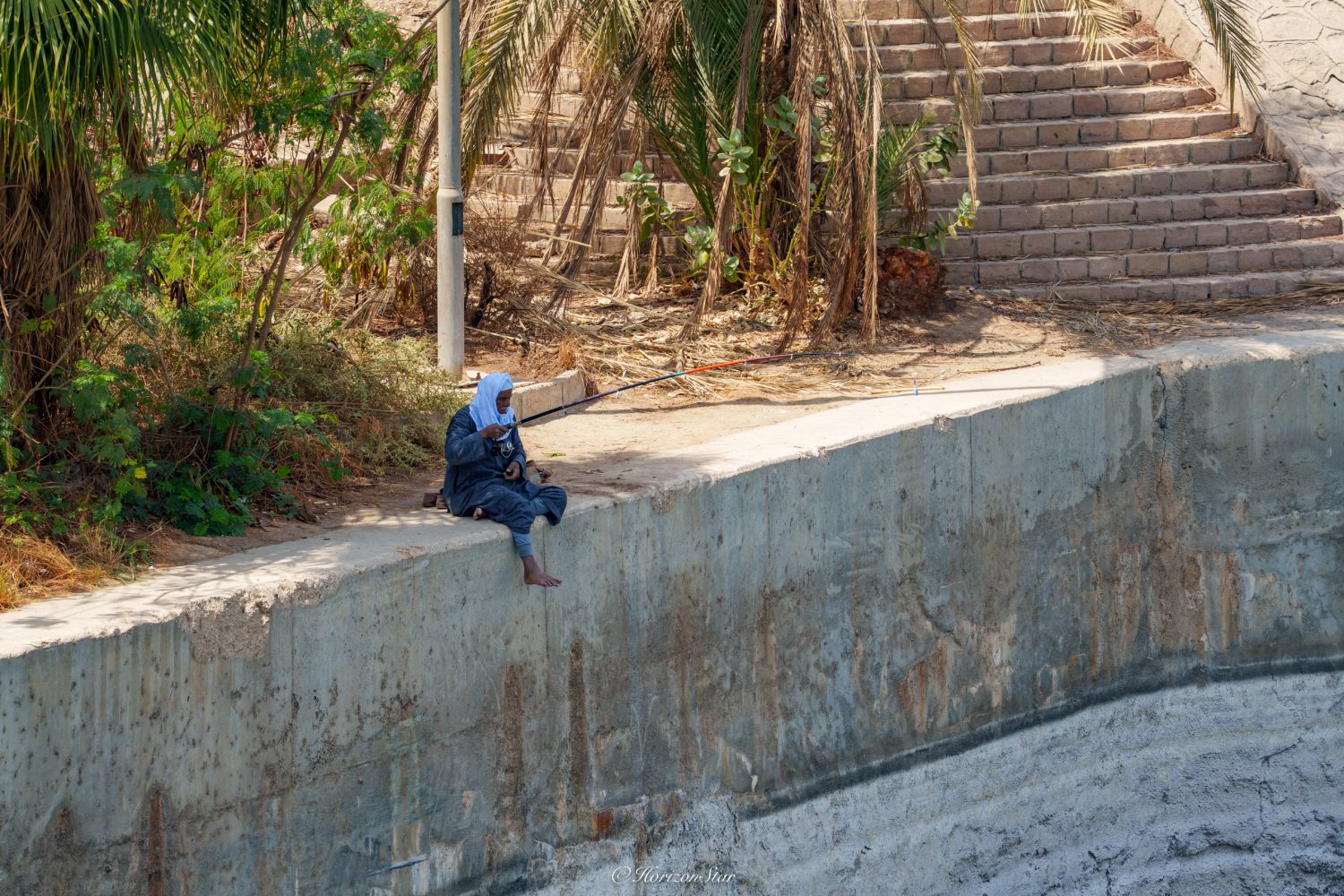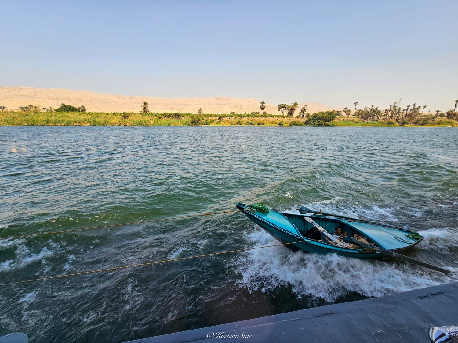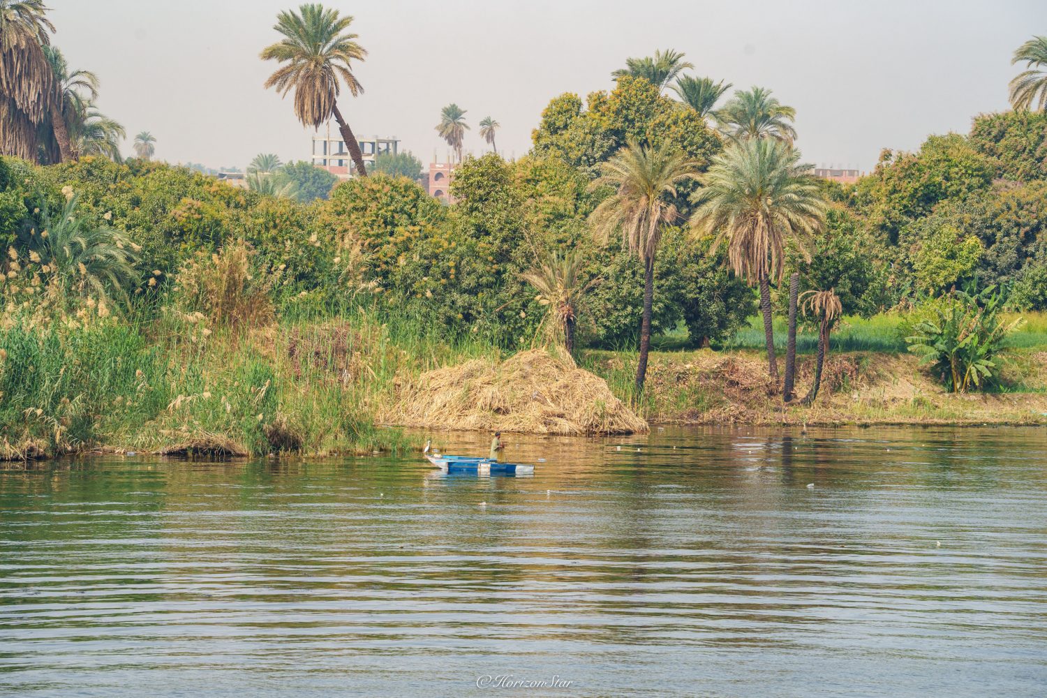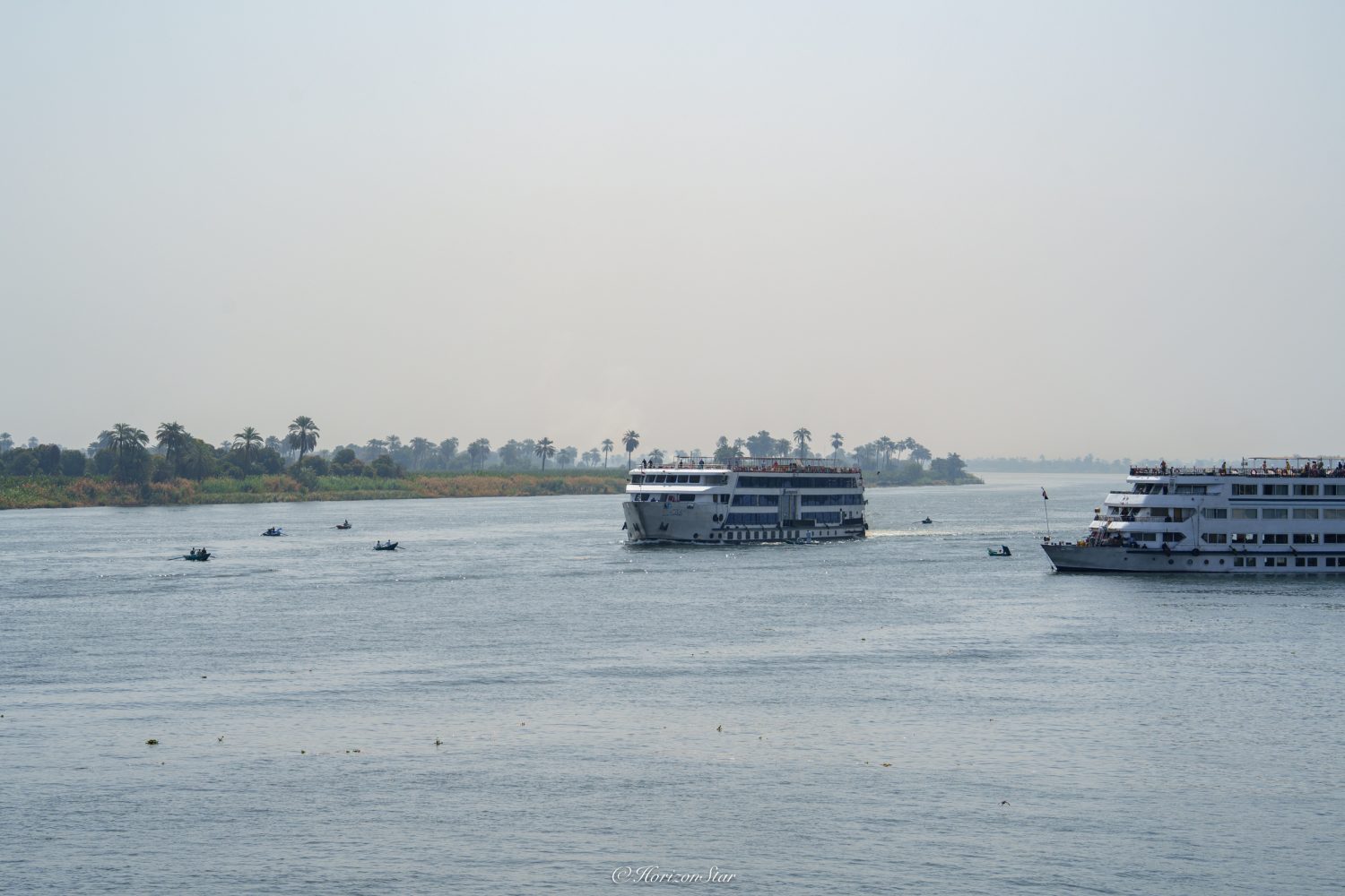一缕浅滩把尼罗河一分为二,竞赛的游轮在两侧深水区,中间的浅水区就有渔夫在打鱼。