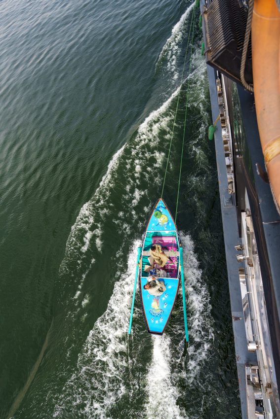 闹哄哄的吃饭的时候船就出发了。这时候舷窗出现了一个小贩,开着小船,挂在我们的船上,冲着舷窗里吃饭的我们打招呼,展示他的小商品。我们都很新奇。因为它出现在对面的舷窗,那边窗户旁边坐着一对日本的小情侣和他们的导游。他俩也掏出手机拍。然后也招呼我们过去拍。