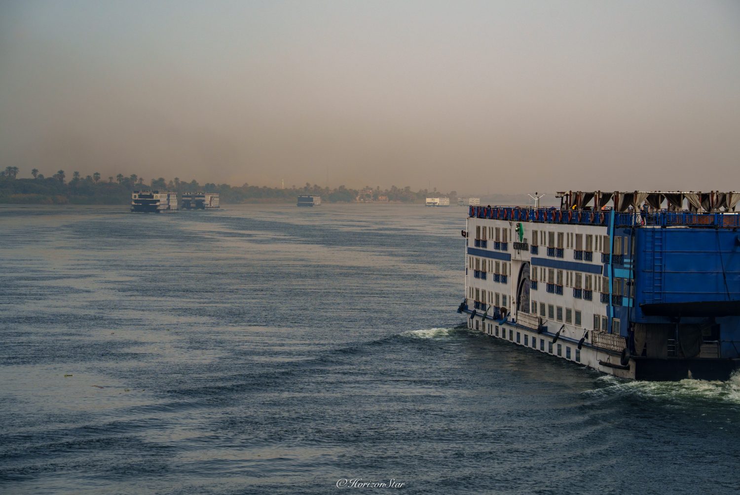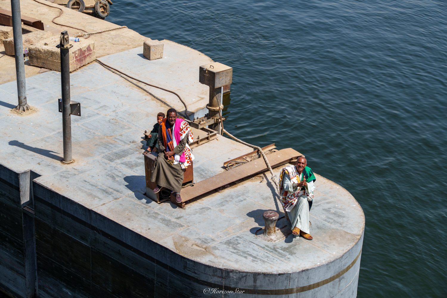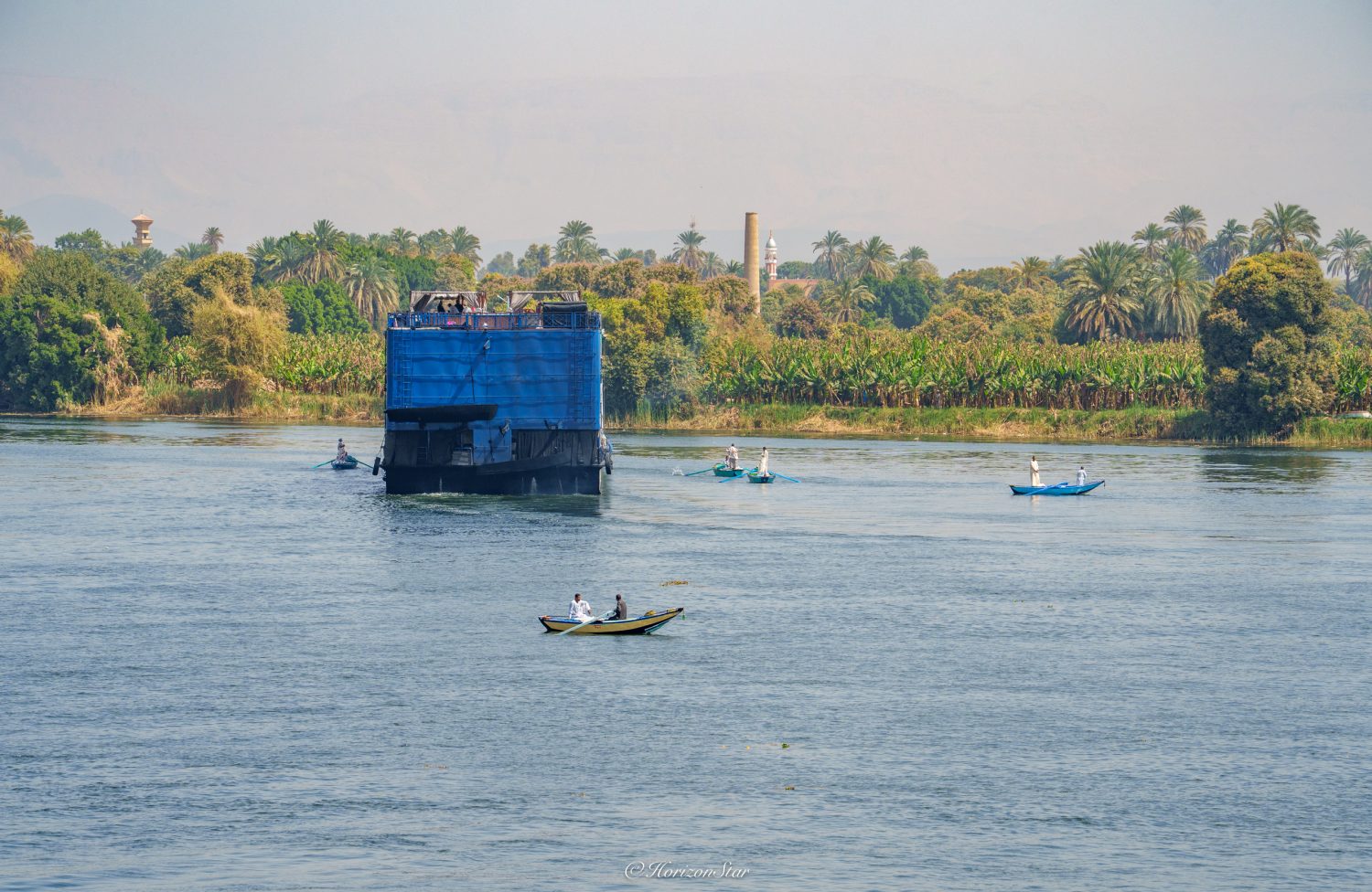 这边交易还在进行着,我们的船已经开始了尼罗河竞速模式。谁能抢先开到闸口,谁先过,谁就能下午就开到Luxor,还可以看灯光秀。不然要第二天才能去冲关,压缩了第二天的行程。因此这是真正意义上的千帆竞渡。不同的是每个都冒着黑烟,把天空染成乌黑的颜色。