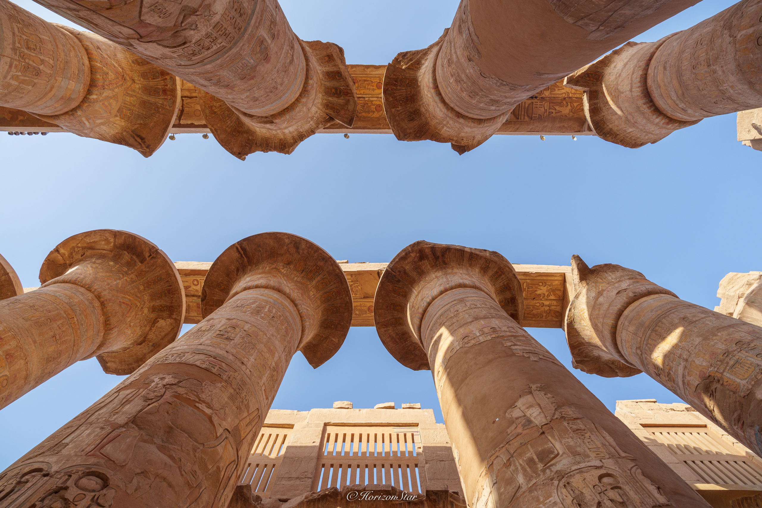 柱子上的横梁,每根重达70吨。4000年前的古埃及人,利用杠杆和人力把这么沉重的石梁稳稳的放到20米高的柱子顶上,不能不说是人类的奇迹。而柱子的头部,都是莎纸草的形状。为防止在施工的过程中损坏,它们都是柱子立起来后,工匠们再上去雕刻出来的。