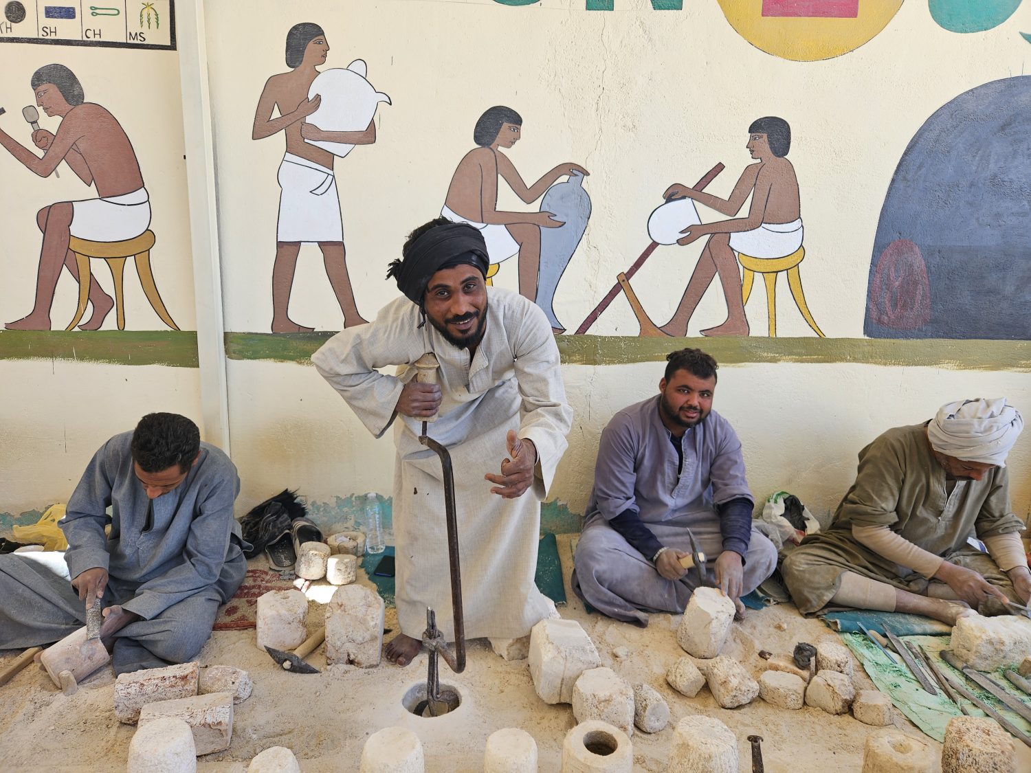 顺便把饭钱和小费给导游结了。出了门口,刚才那排在展示怎么做各种石头的工匠们热情地招呼我们过去。