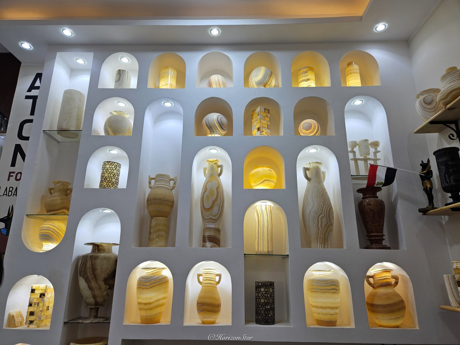 去帝王谷之前,导游领我们先去了一家雪花石(alabaster)的小作坊。里面琳琅满目的雪花石石雕,有的做的是相当的精美。两家人各入手了几件。