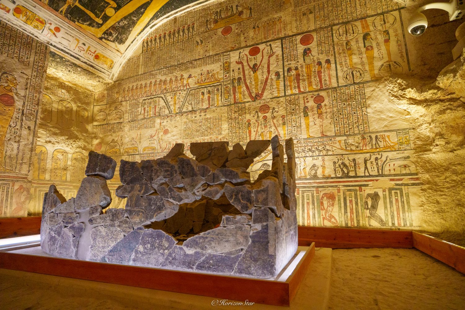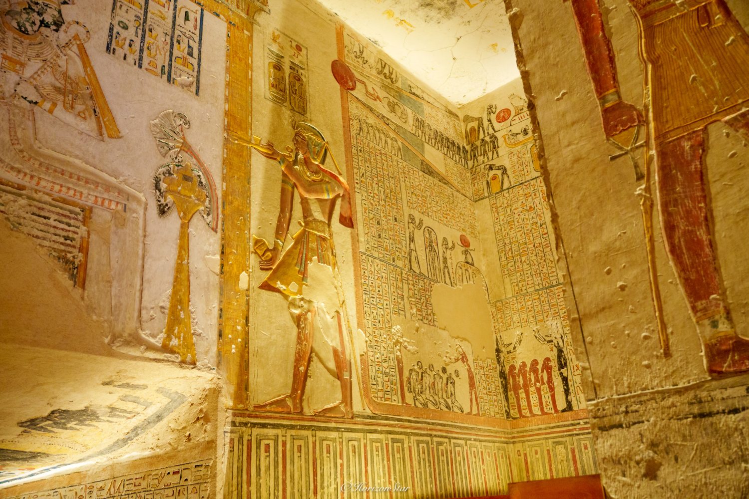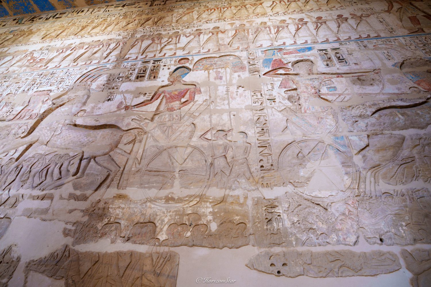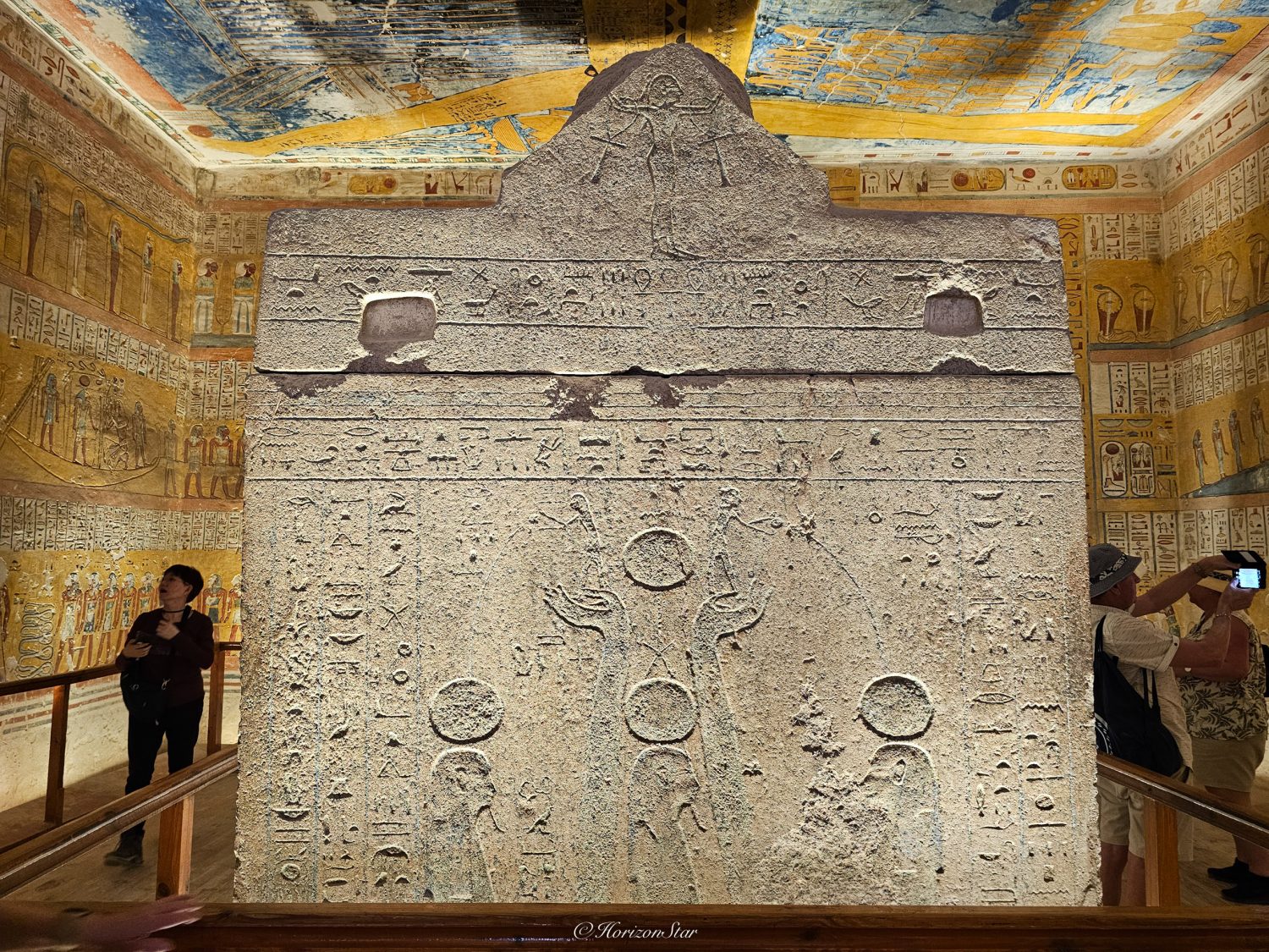 四面八方,刻着被砍掉头颅的俘虏们,平民,法老和太阳神,按照阶层一阶阶的往上排到了天花板。