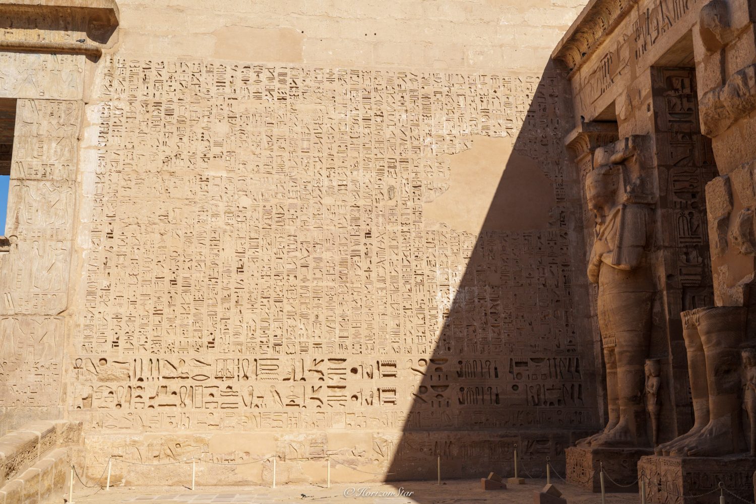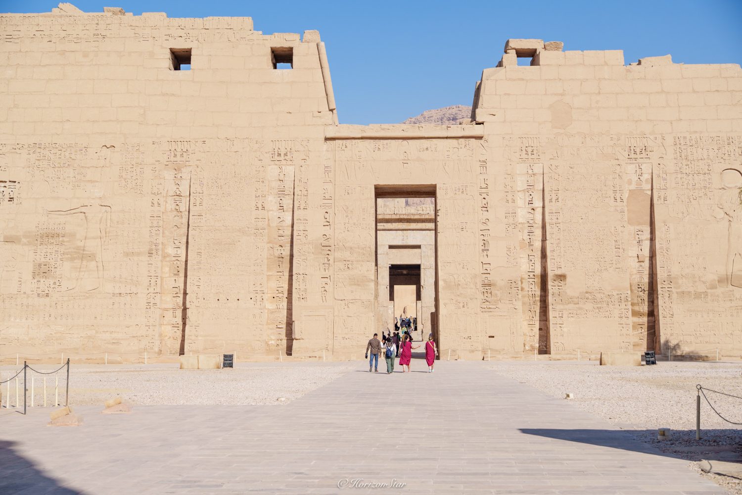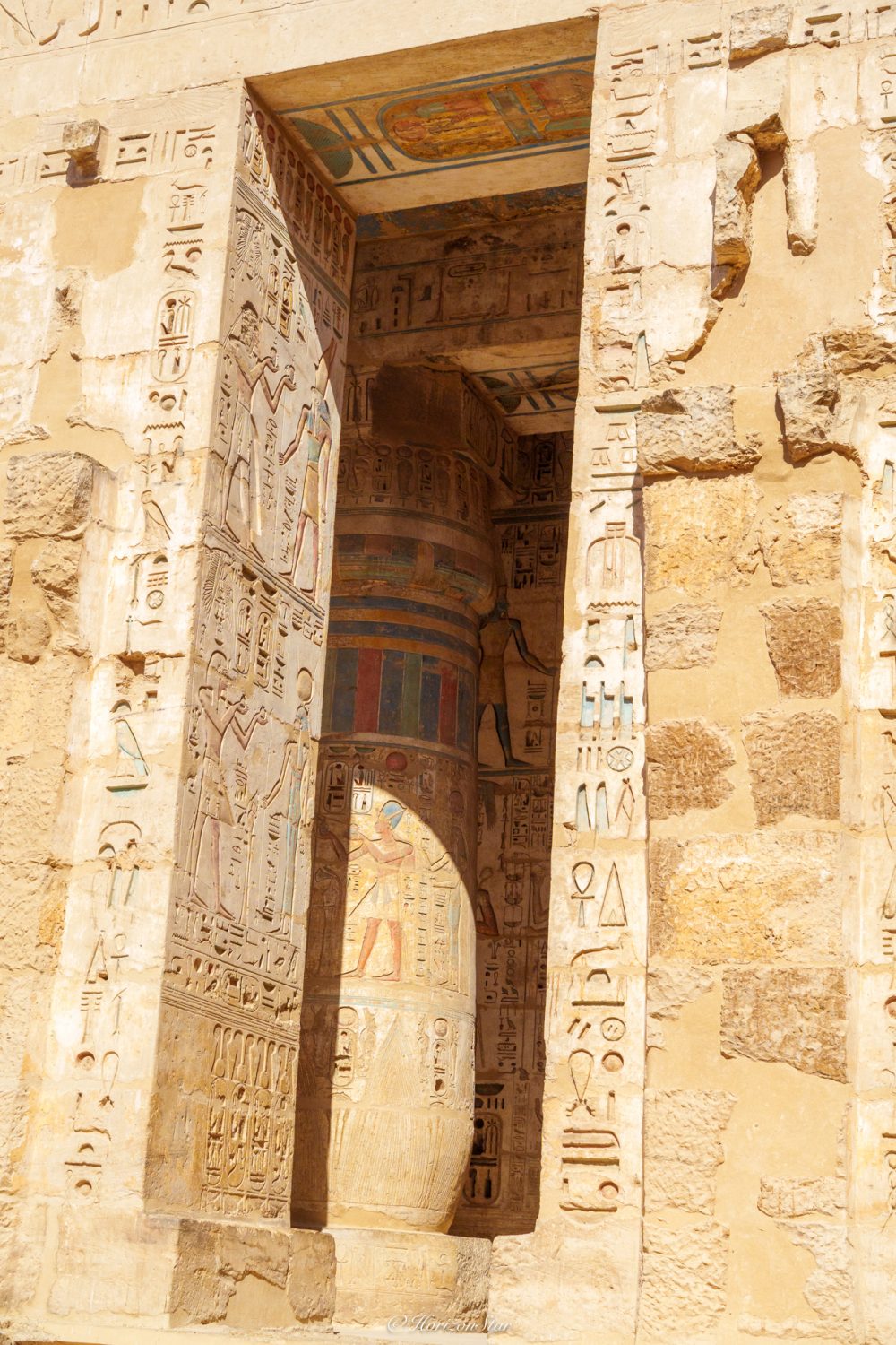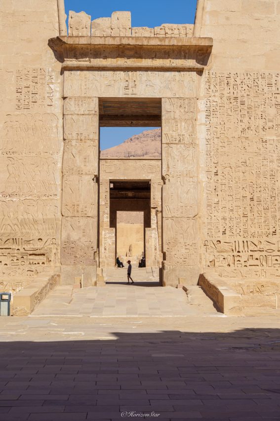 进了神庙的入口,现在是查票的门口,就看到气势恢宏的一面城墙般的门塔。这些天看的都是这个。现在只把他当做推迟参观帝王谷的一个杀时间的附属项目,随便看看 ,结果却有惊喜。这个神庙是拉美西斯三世模仿拉美西斯二世的卢克索神庙建立的。三世和二世并没有什么亲戚关系,两个人也差了100多年的时间。只是当初法老的名字都这么多,重名的就按顺序在自己名字后+1。