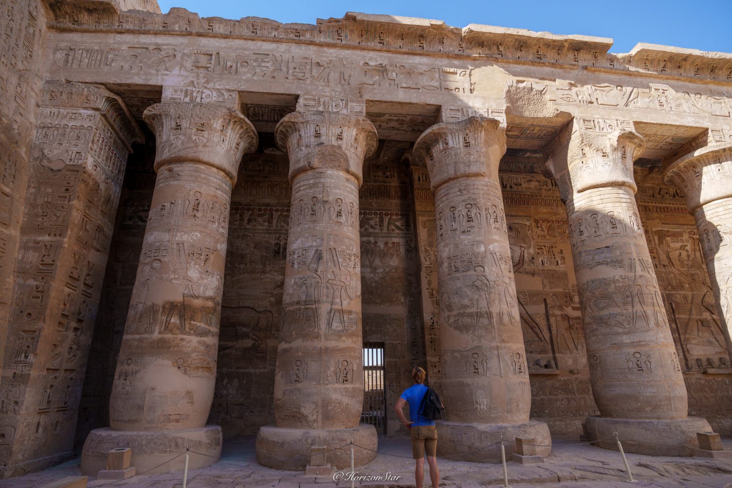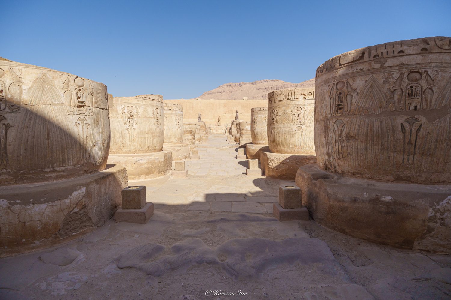 进到神庙的中心区,照例是两排大柱子立在两侧。这些柱子矮矮胖胖的。和东岸昨天看的两个神庙上来都是高耸入云的石柱不同。
