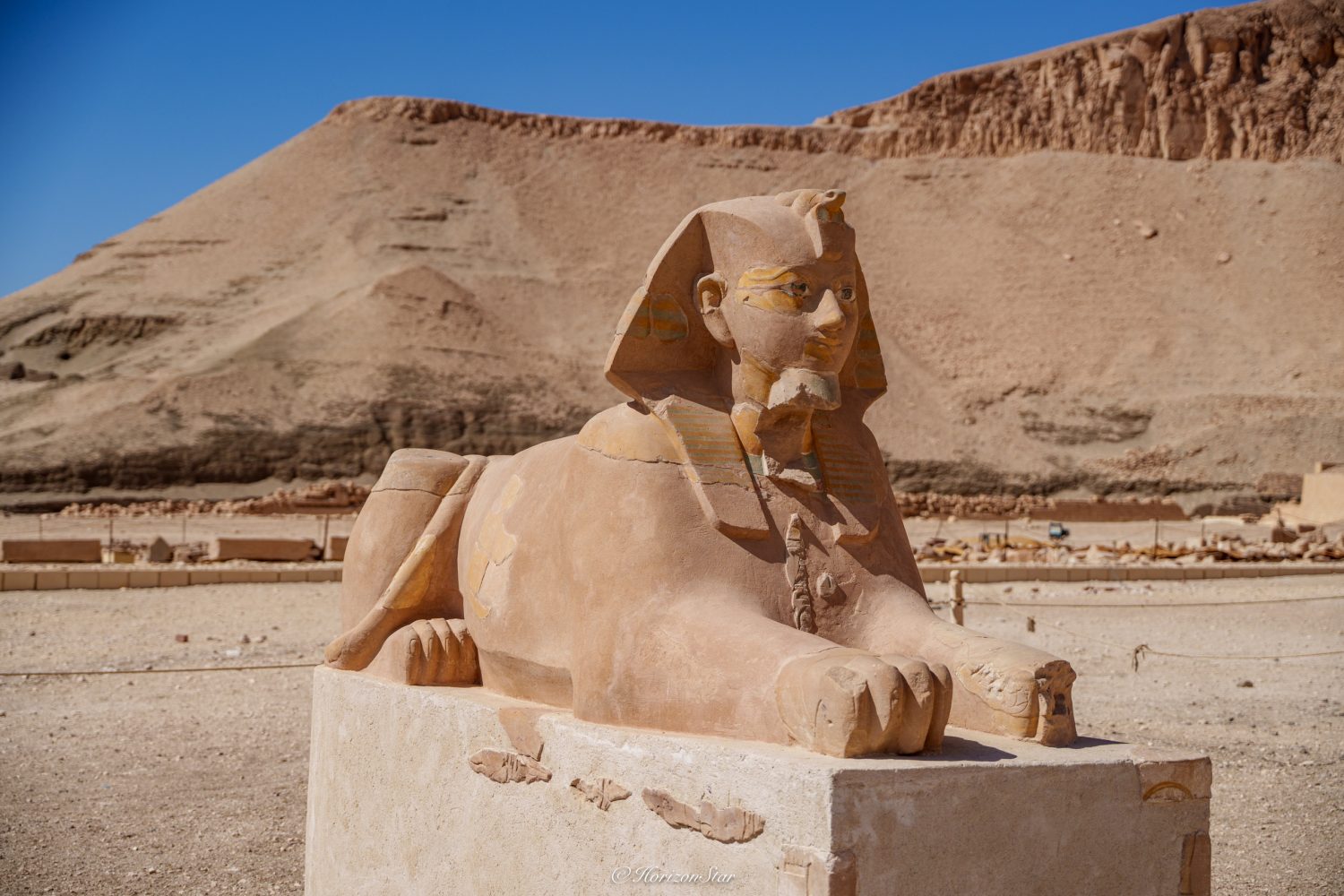 入庙的大道两侧照例是应该两排狮身人面像夹道相迎。但是基本上都不存在了,不是被上集提到的她的侄子给凿掉了,就是掩埋在风沙里了。残存下来几个中,也只有一个还有女法老的面部。