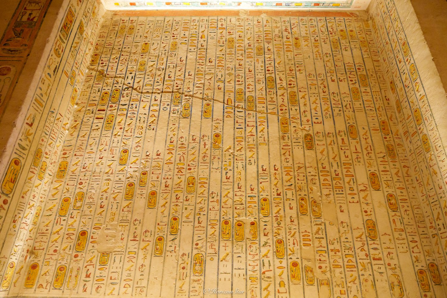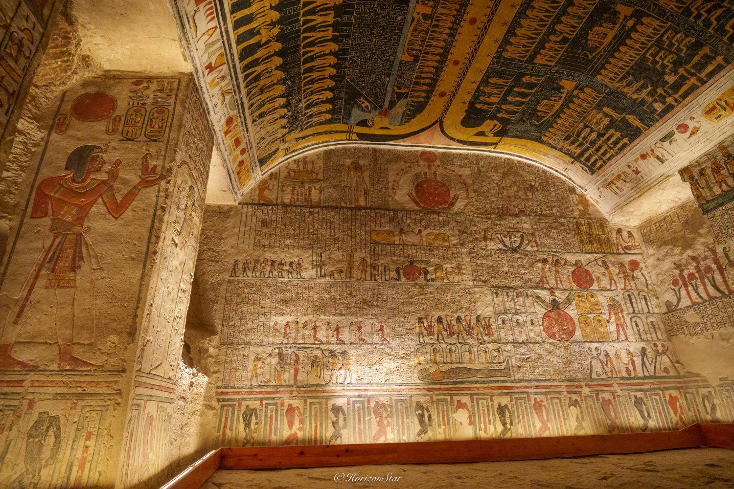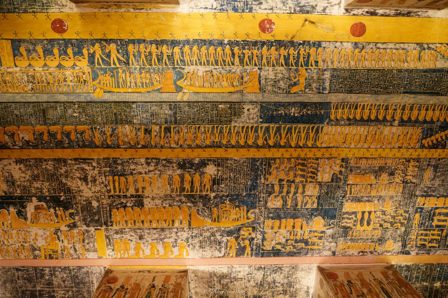 天花板上刻画着日之书,太阳被一圈”火“字围绕着,太阳下的尼罗河,尼罗河上的太阳船,法老,神明,平民,俘虏塞得满满的,好像早晨的游客们。