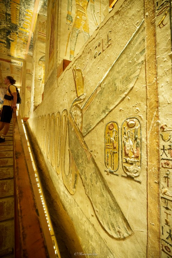 墓道的两侧刻着精美的象形文字。虽然看不懂,但是只看鲜活的颜色和生动的形象,感觉这些文字都有了生命,似乎要飞出墙壁的桎梏