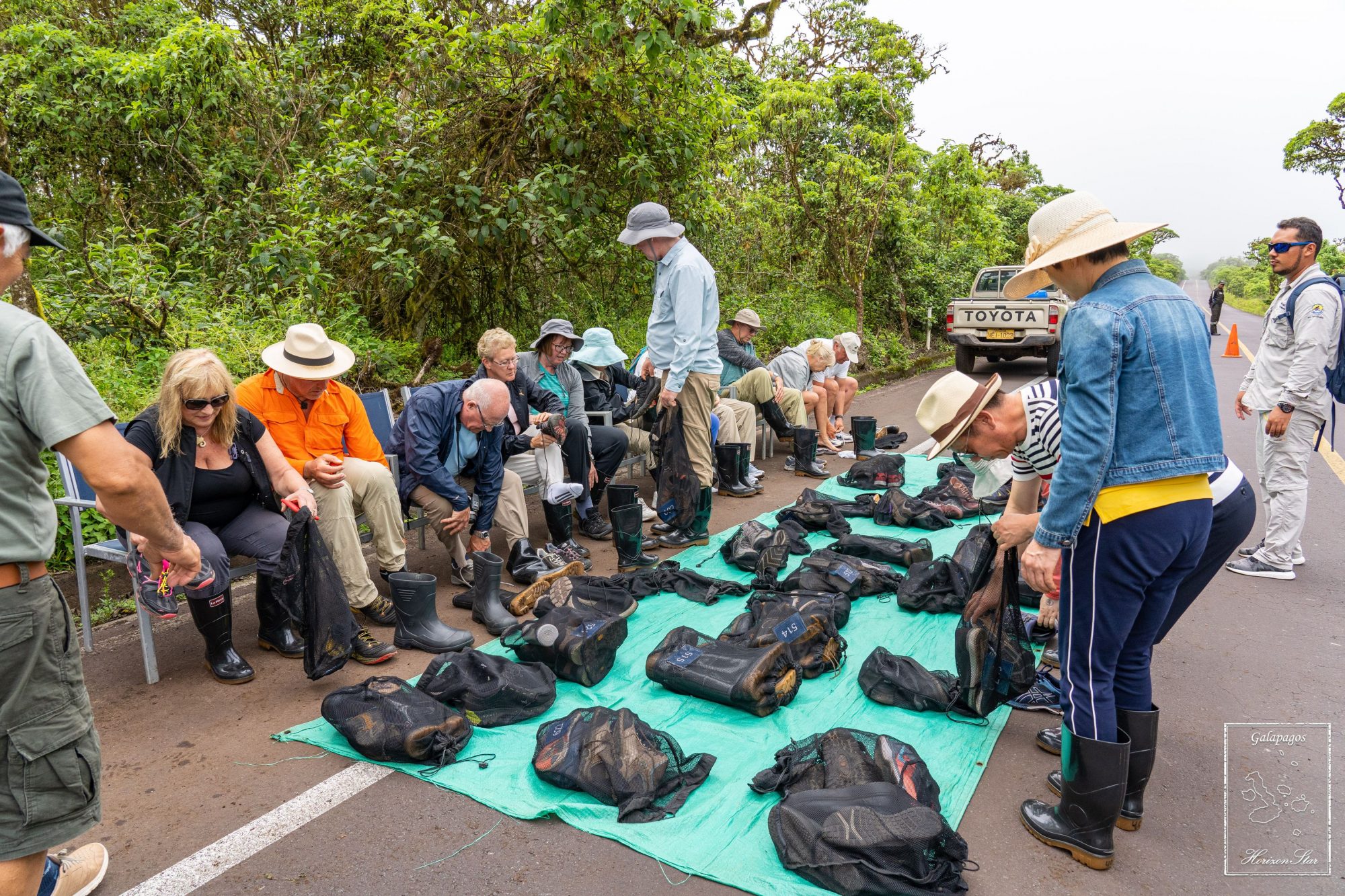 下一个活动就是亲自给岛上种一棵树。船公司没人发一双靴子,然后去领一棵沾着土的小树苗,一把小铲子,领队就领我们进到树林里。到了给我们预定的区域里一看,坑都给你挖好了,就把树根上的塑料袋扒下来,然后把小树苗放里面,用小铲子压一压土就好了。大家就算给群岛做了点贡献。有点像领导人植树节出来摆摆样子一样。