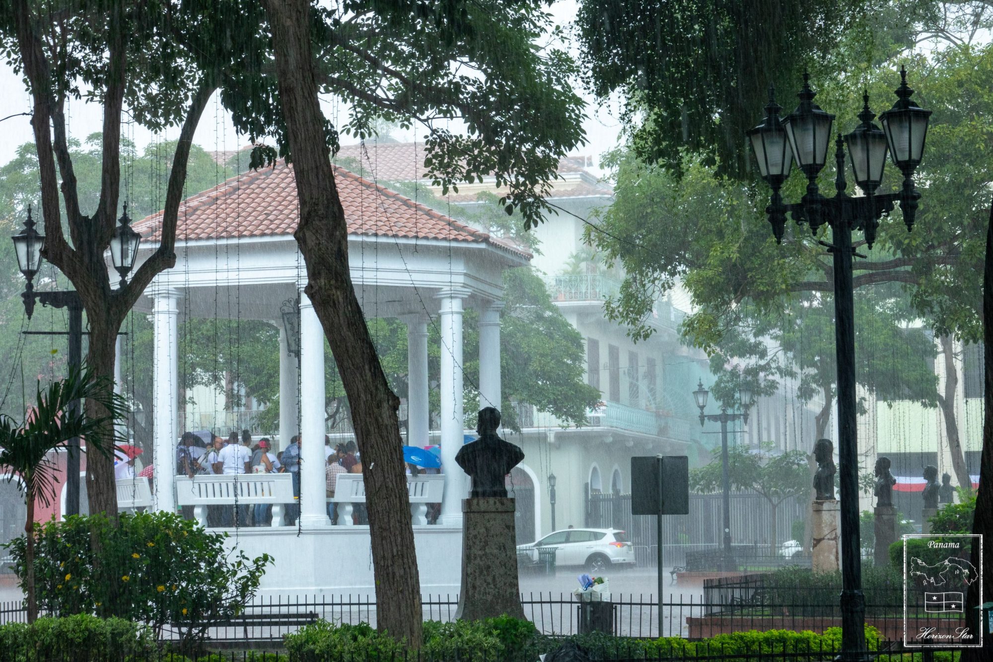 已经很多人在里面躲雨了。亭子里面靠边的位置完全挡不住雨,大家都挤在亭子中央。